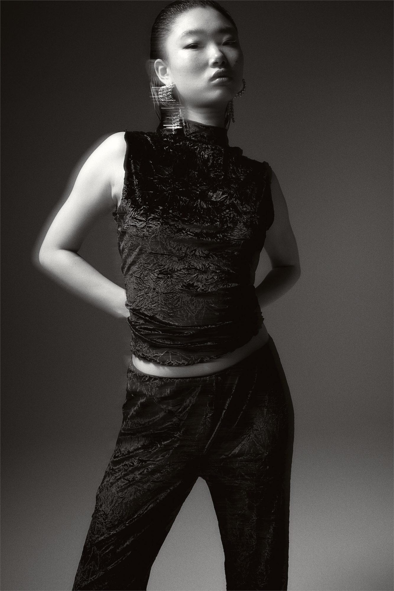 Облегающий жилет из мятого велюра с черепаховой горловиной и оверлоком по проймам и подолу.