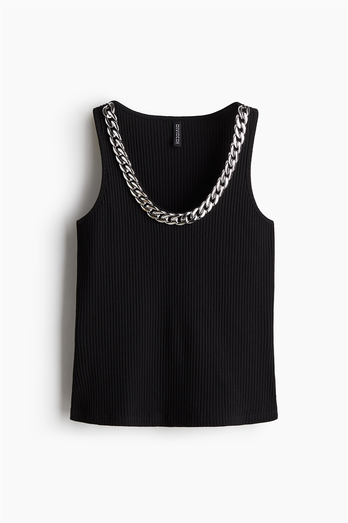 Облегающая майка из ребристого трикотажа с глубоким круглым вырезом и декоративной деталью в виде цепочки по переднему краю.