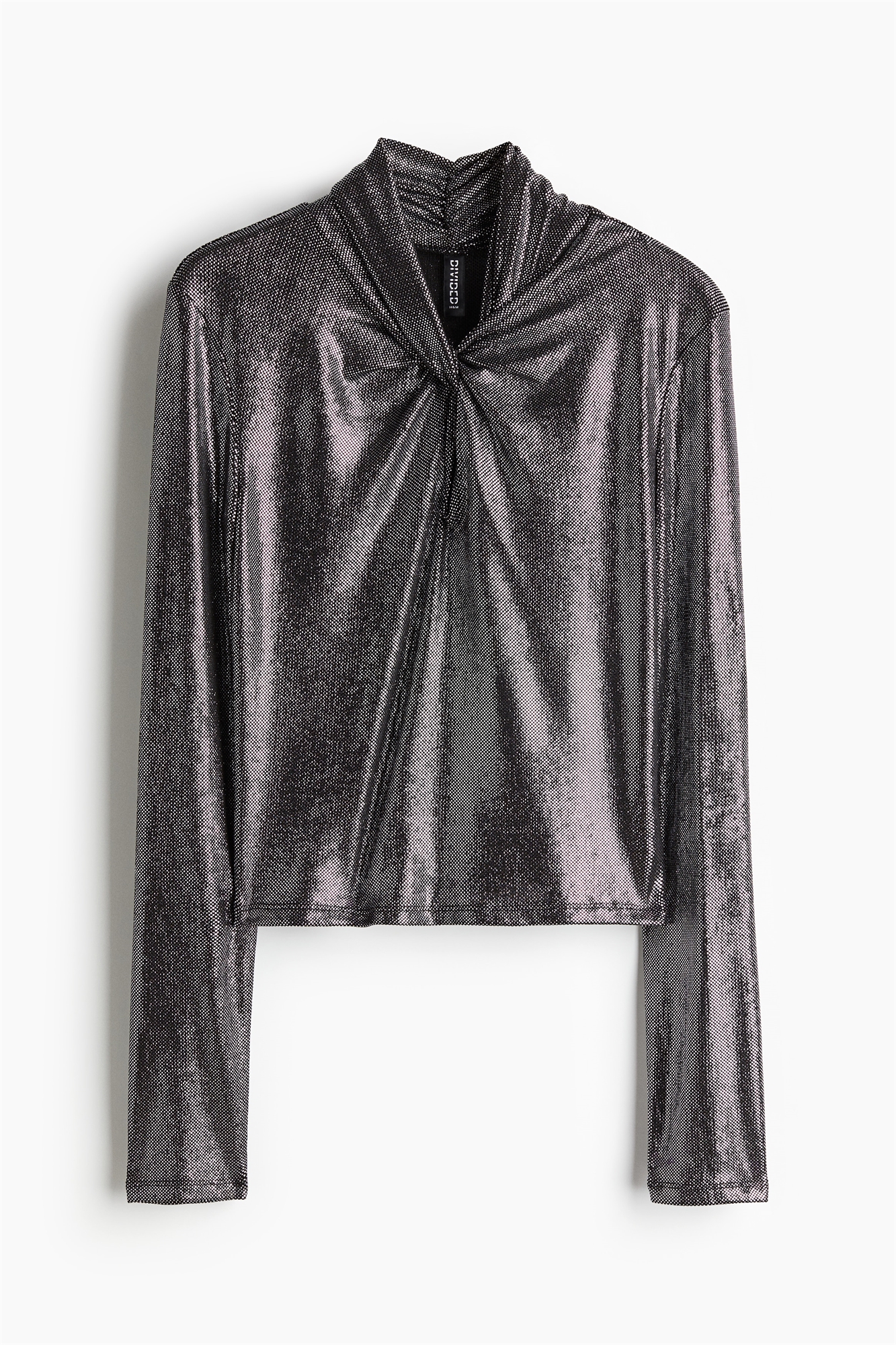 Короткий приталенный топ из джерси-стрейч с принтом из фольги, создающим мерцающий, блестящий эффект. Воротник-стойка с перекрученной деталью спереди, создающей эффект легкой драпировки. Длинные рукава и прямой подол.