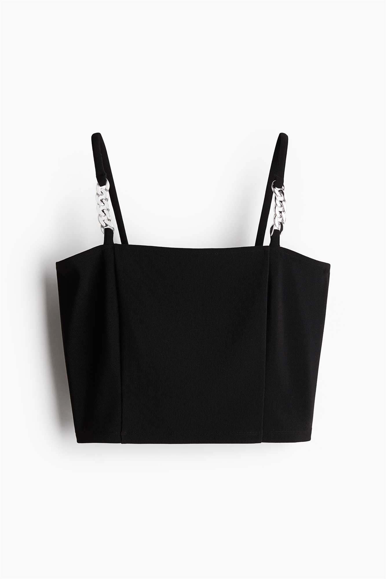 Приталенный топ из ребристого джерси с квадратным вырезом и узкими бретелями с декоративной деталью в виде цепочки спереди. Видимые швы спереди и прямой подол.