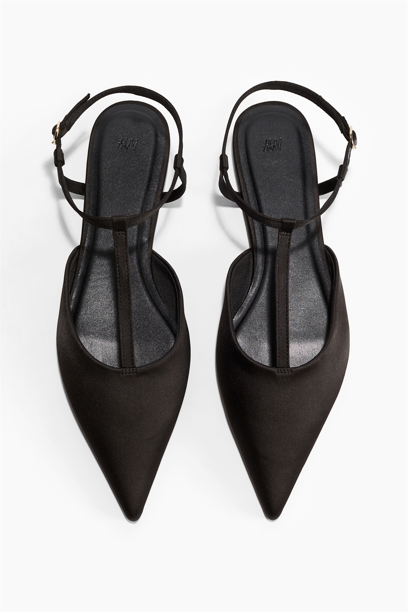 Плоские сандалии из блестящего атласа. Заостренные носки и классический Т-образный ремешок. Регулируемый ремешок на щиколотке с круглой металлической пряжкой. Атласная подкладка.