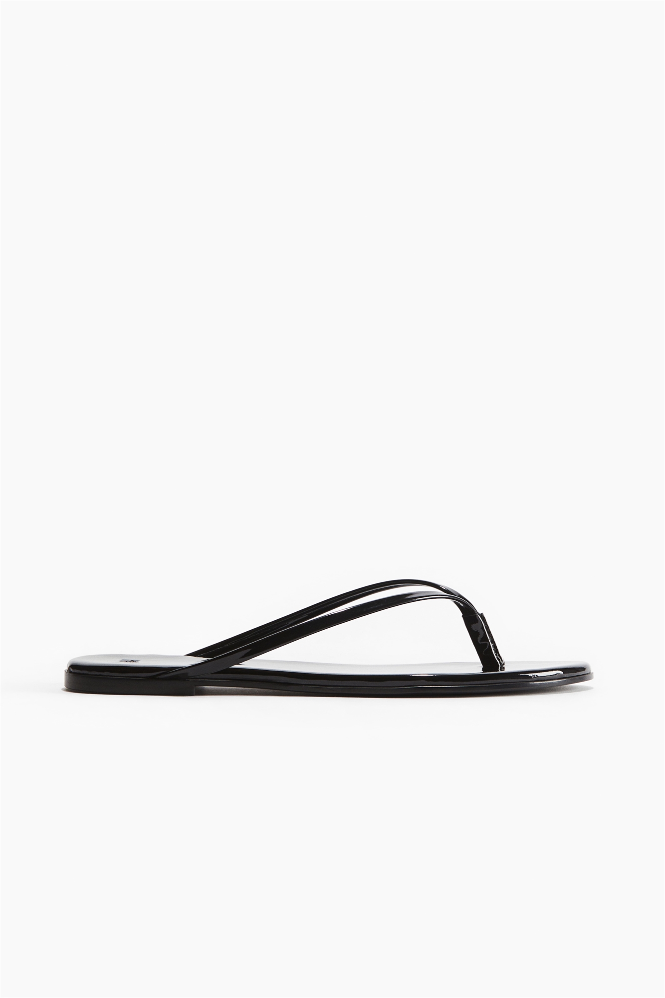 Стильные шлепанцы из лакированной ткани с узкими ремешками.