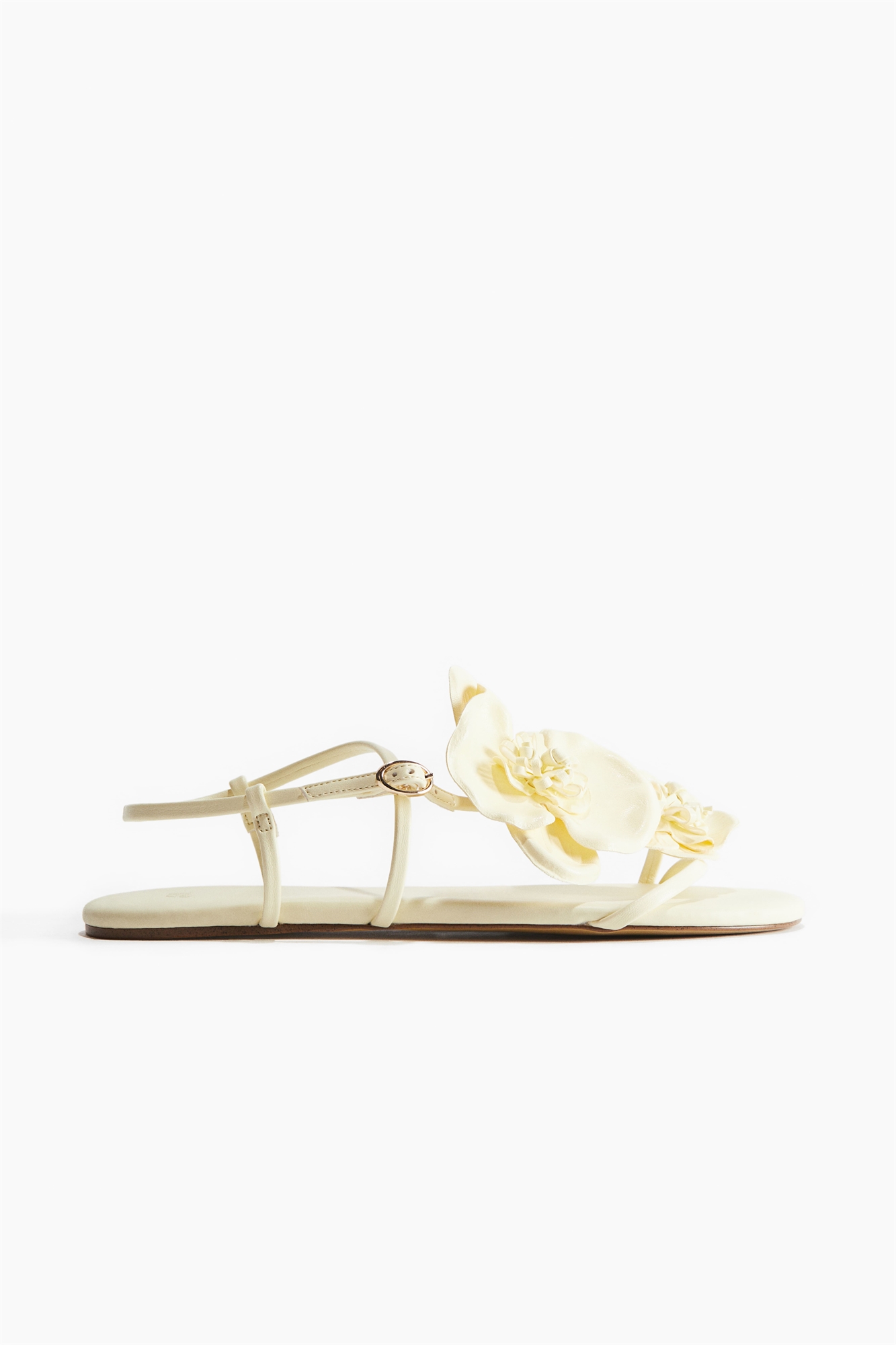 Сандалии на бретельках из мелованной ткани с закругленными носками и крупными цветочными аппликациями по всей стопе. Узкий регулируемый ремешок на щиколотке с овальной металлической пряжкой.
