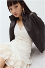 Короткое платье из тканого материала с V-образным вырезом, узкими регулируемыми бретелями и потайной застежкой-молнией сзади. Приталенный лиф с собранными швами спереди, сзади и по бокам для создания эффекта рюша. Аккуратная расклешенная юбка с тремя ярусами. На подкладке.