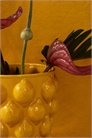 Большая ваза из керамики, украшенная скульптурным декором в виде фруктов и покрытая глянцевой глазурью. Диаметр основания 9 см. Высота 28 см.