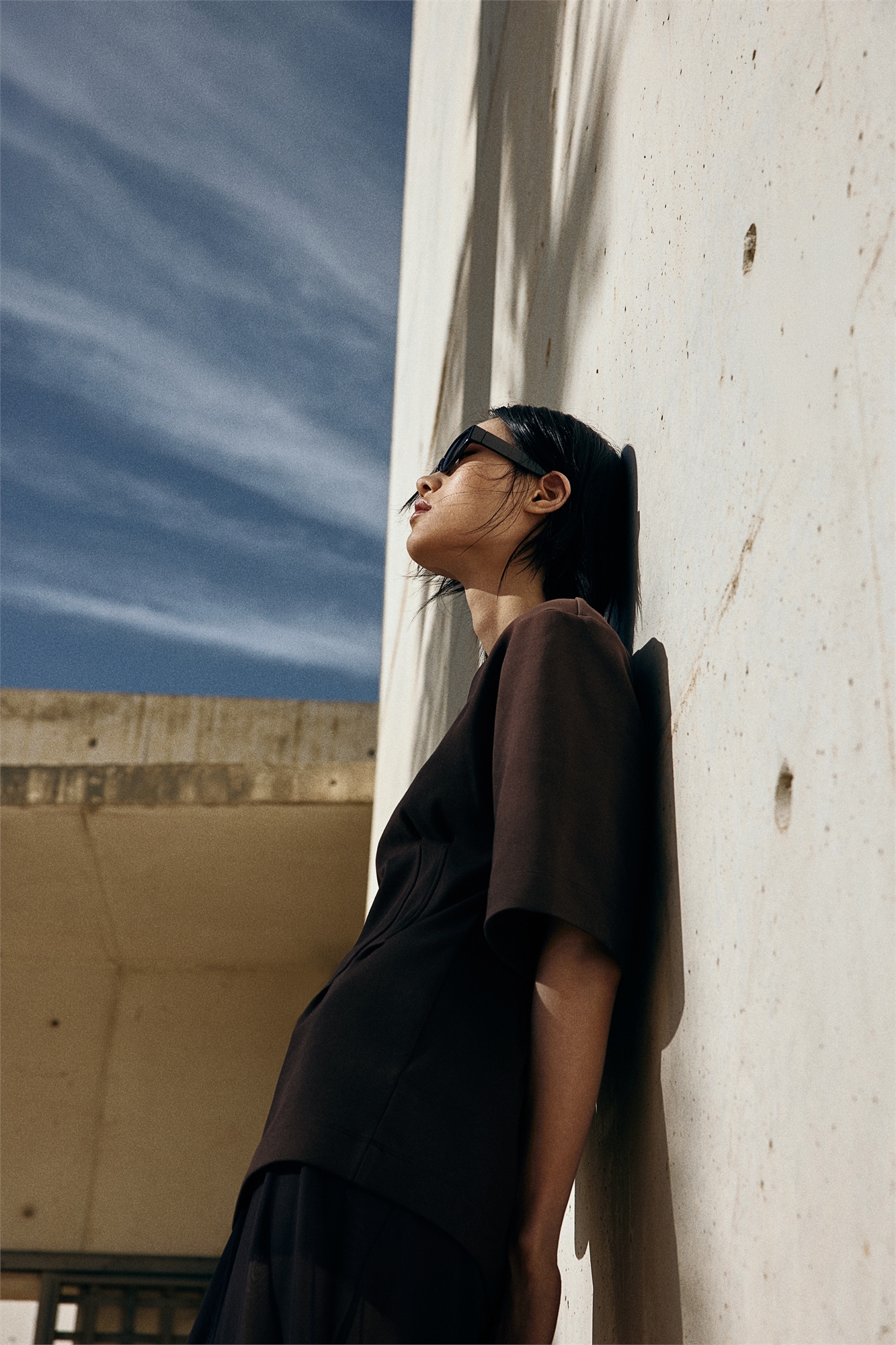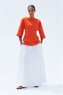 Длинная футболка из плотного хлопкового джерси с вырезом-лодочкой и зауженной талией с легкими накладными вытачками спереди и сзади. Спущенные плечи и широкие рукава длиной до локтя.