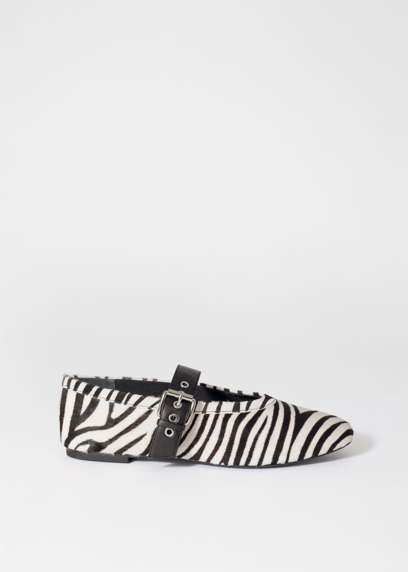 Классические балетки "Мэри Джейн" - это новый взгляд на классику. Они выполнены из фактурной кожи с принтом зебры, широкие регулируемые ремешки с пряжками пересекают современные миндалевидные пальцы. Носите их с джинсами, платьями или фраками.