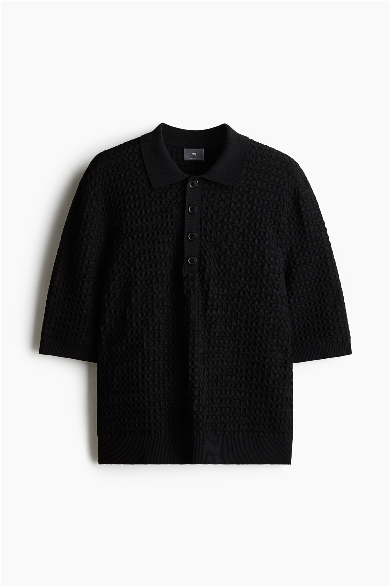 Рубашка-поло из вафельного трикотажа с ребристым воротником, застежкой на пуговицах, рукавами длиной до локтя и окантовкой на манжетах и подоле. Регулярный крой для комфортной носки и классического силуэта.