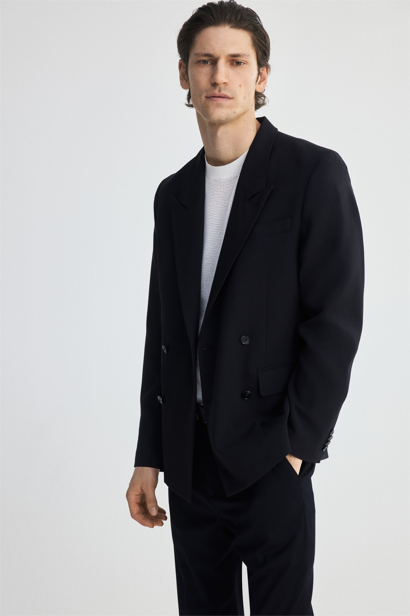 Двубортный блейзер из мягкой ткани с пикообразными лацканами с декоративной петлей для пуговицы, нагрудным карманом, втачными передними карманами с клапаном и тремя внутренними карманами. Декоративные пуговицы на манжетах и двойной задний клапан. Свободный крой для непринужденного, но не чрезмерного силуэта. На подкладке.