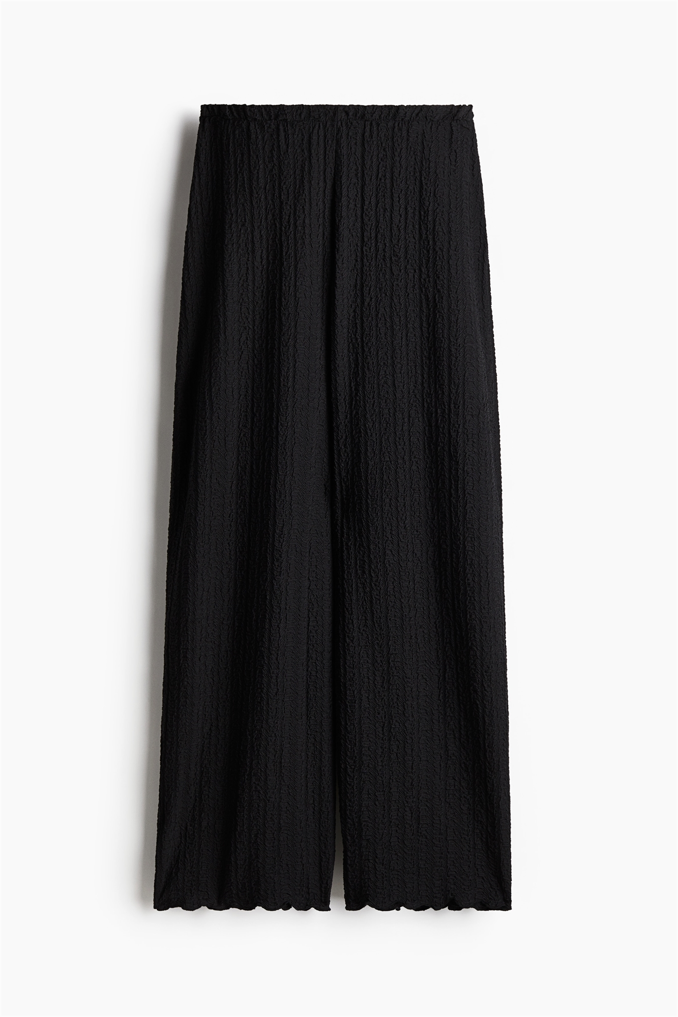 Свободные брюки из фактурного трикотажа с высокой эластичной талией и широкими штанинами с оверлоками.
