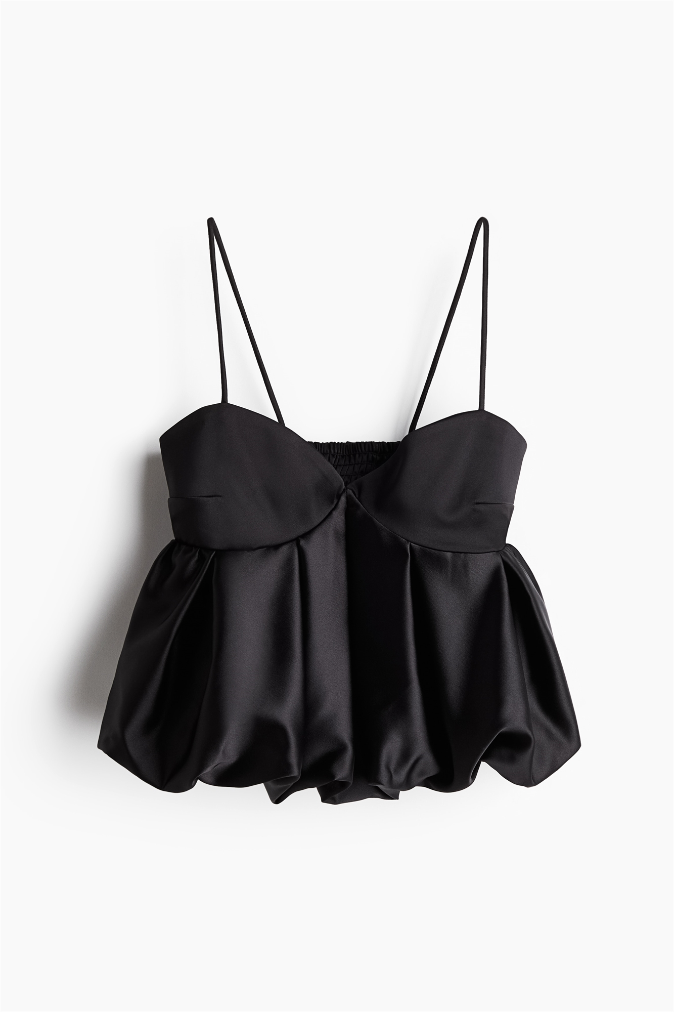 Топ из атласа с вырезом в форме сердца, бретельками-спагетти и скроенной деталью сзади. Видимый шов со складками под бюстом и расклешенным пеплумом с пузырчатым подолом для пышного силуэта. На подкладке.