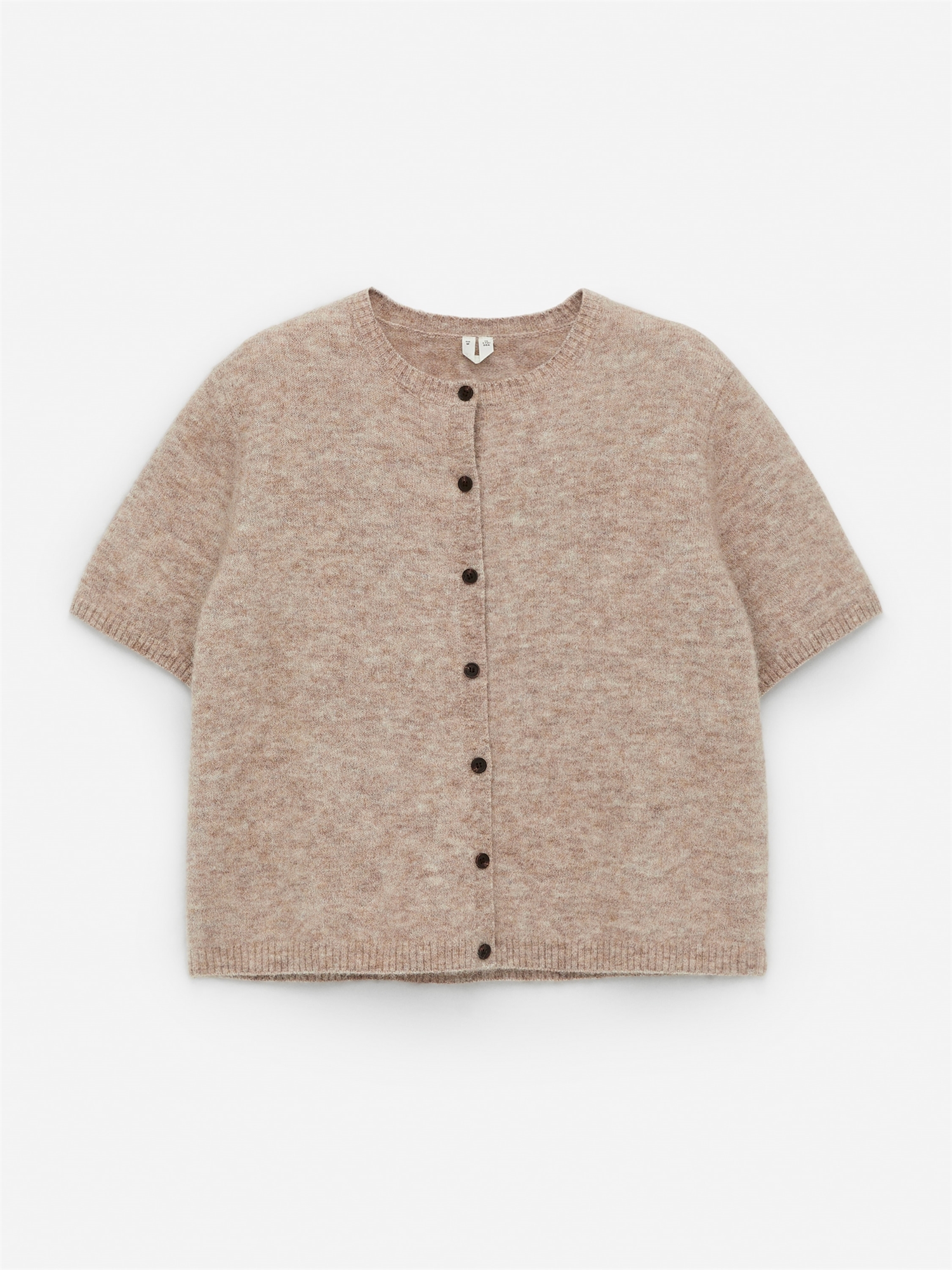 Этот кардиган с короткими рукавами можно носить как с топом, так и самостоятельно. Классический фасон с круглым вырезом и застежкой на пуговицы. Кардиган связан гладкой вязкой из смеси альпаки и украшен ребристой отделкой.