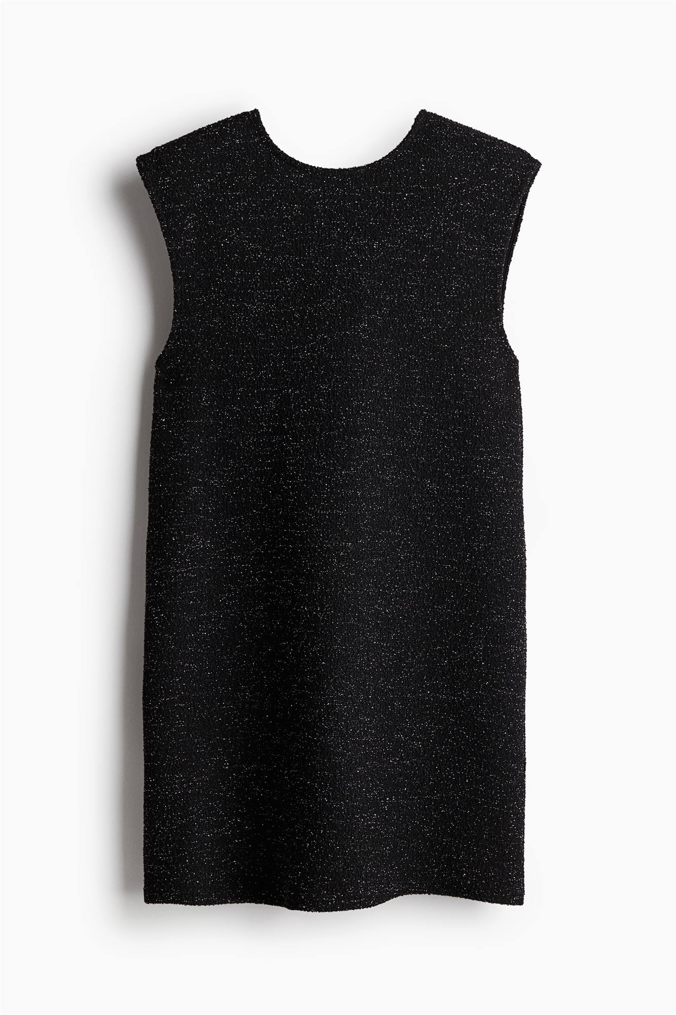 Мини-платье без рукавов из блестящего джерси с круглым вырезом и глубоким V-образным разрезом сзади с декоративным бантом. Накладки на плечах придают силуэту четкость.