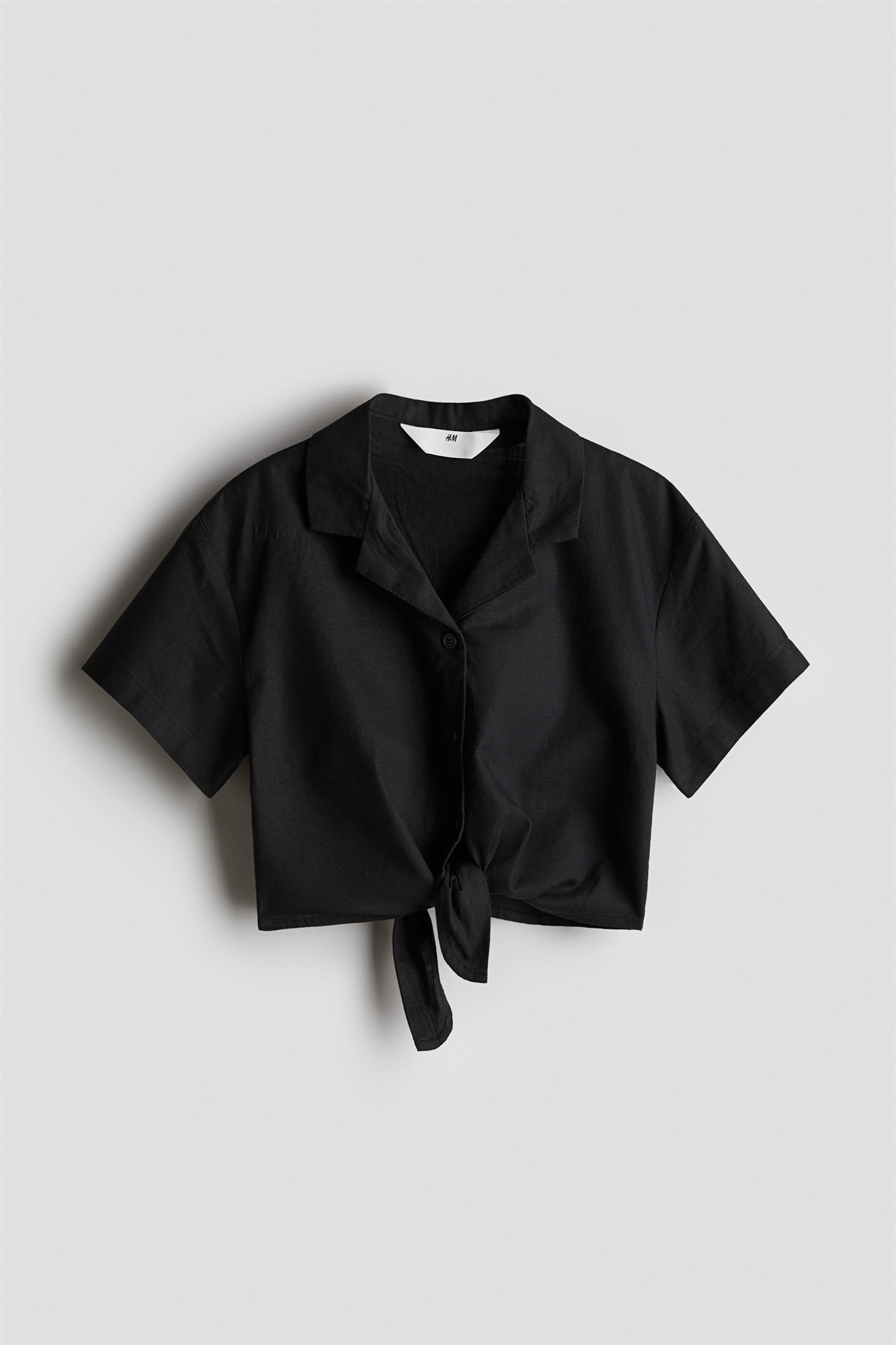 Обрезанная рубашка мягкого плетения из смеси хлопка и льна. Курортный воротник, спущенные плечи и короткие рукава. Пуговицы спереди и деталь в виде узла на подоле.