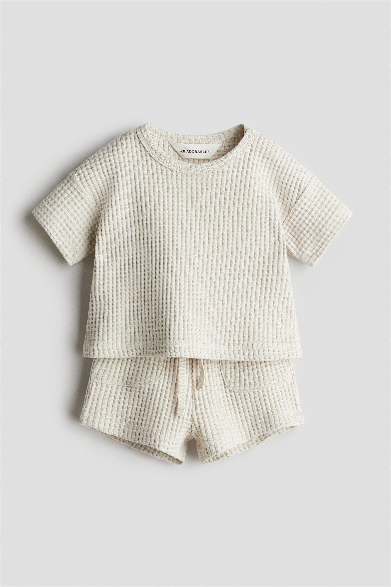 H&M Adorables. Комплект из футболки и шорт из мягкого вафельного джерси, изготовленного из высококачественного хлопка. Футболка свободного покроя с круглым вырезом с застежкой на кнопке с одной стороны, спущенными плечами и короткими рукавами. Шорты с эластичным утягивающим поясом и накладными передними карманами. Наш хлопковый трикотаж имеет высокий показатель GSM, что означает более плотное и прочное качество без ущерба для комфорта. Коллекция H&M Adorables - это подборка качественных вещей с высоким уровнем комфорта, которые не подвластны времени.