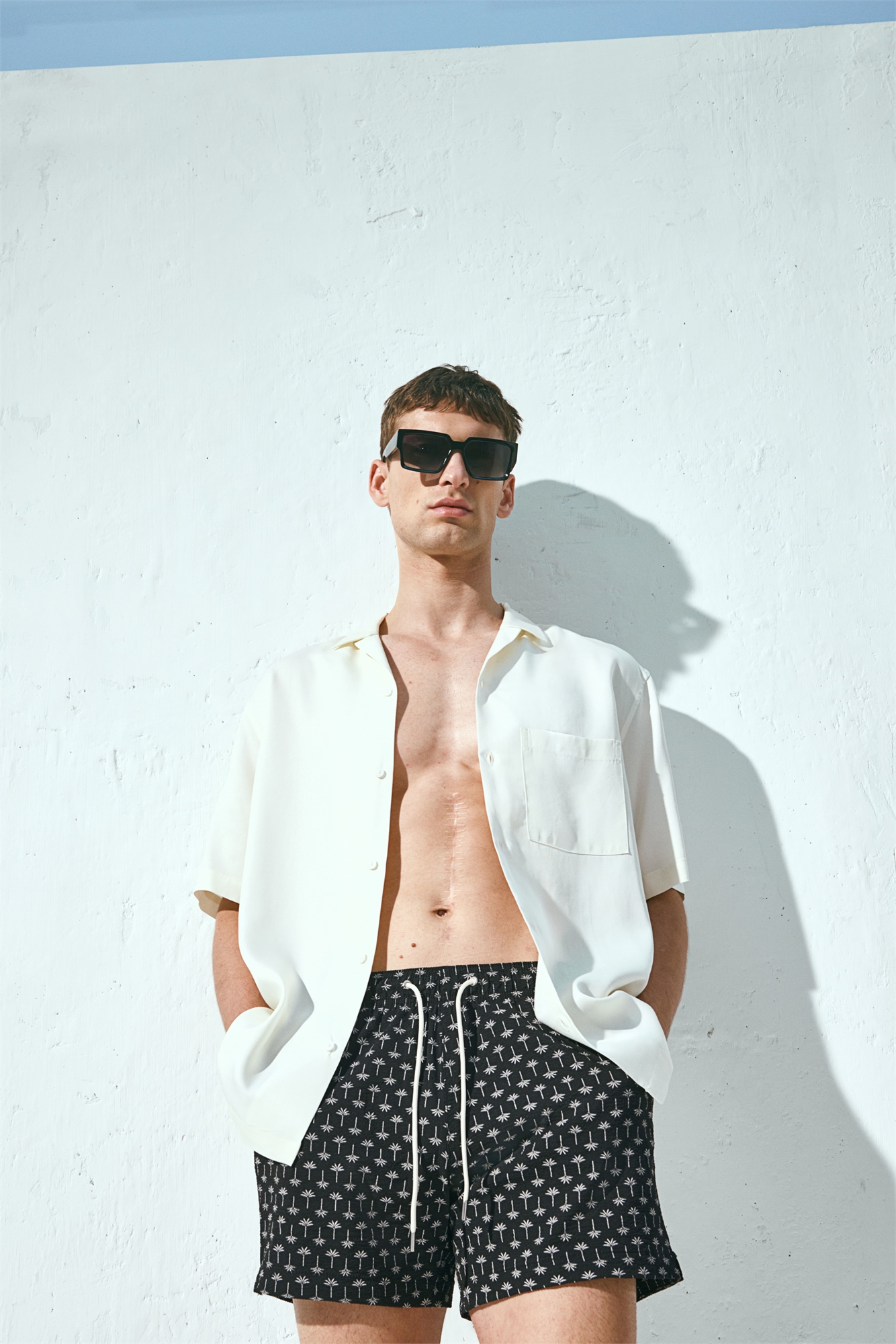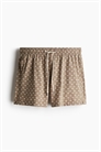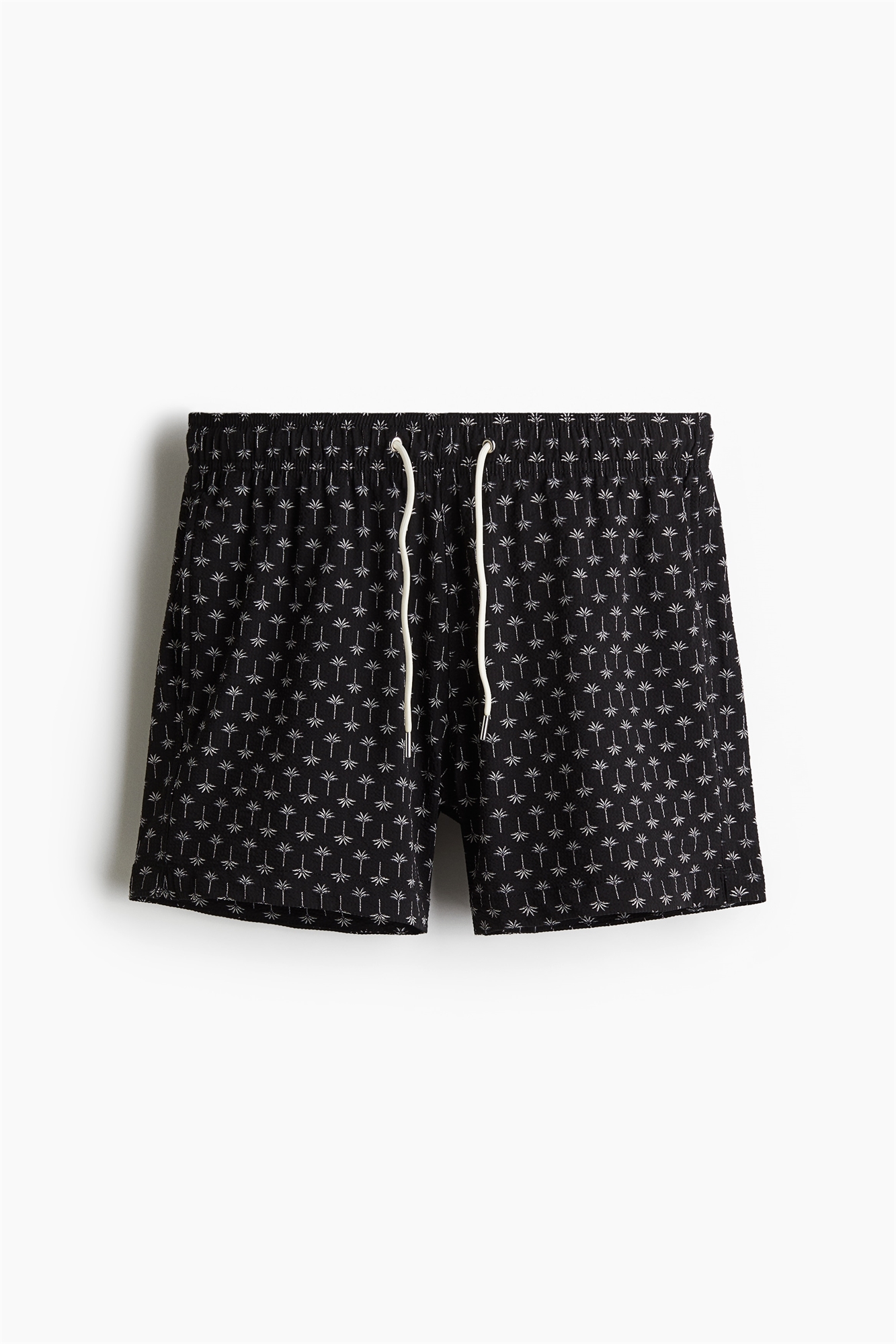 Шорты для плавания из узорчатого трикотажа с эластичным материалом и завязкой на талии, боковыми карманами, накладным задним карманом с застежкой на крючок и петлю и ногами, заканчивающимися выше колен, с небольшим разрезом по бокам. Внутренние шорты из мягкой сетки.