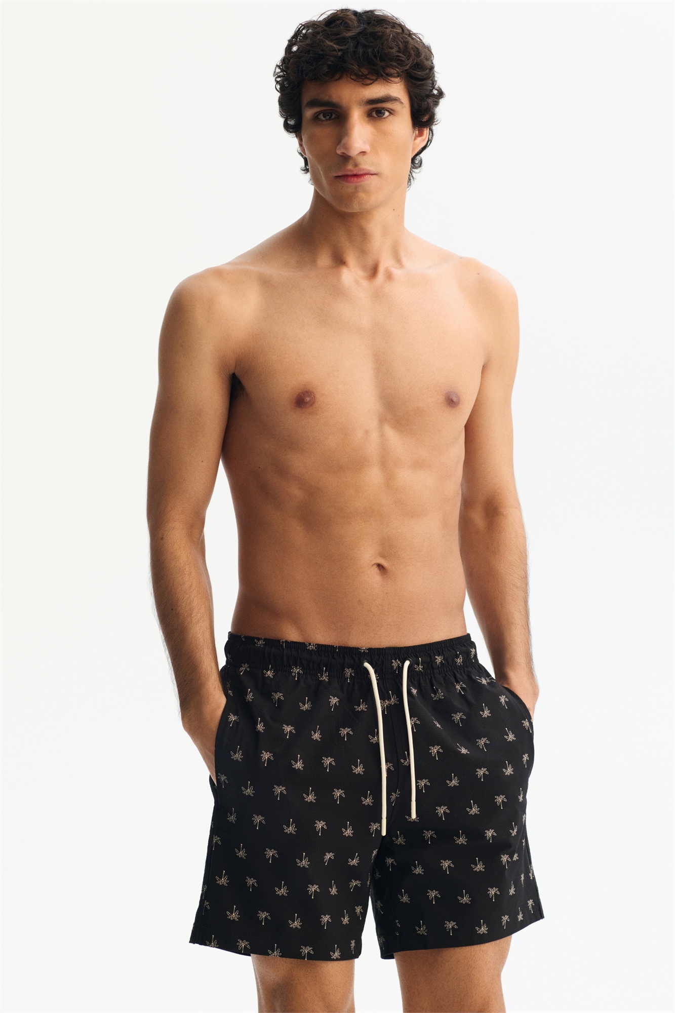 Шорты для плавания из узорчатого трикотажа с эластичным материалом и завязкой на талии, боковыми карманами, накладным задним карманом с застежкой на крючок и петлю и ногами, заканчивающимися выше колен, с небольшим разрезом по бокам. Внутренние шорты из мягкой сетки.