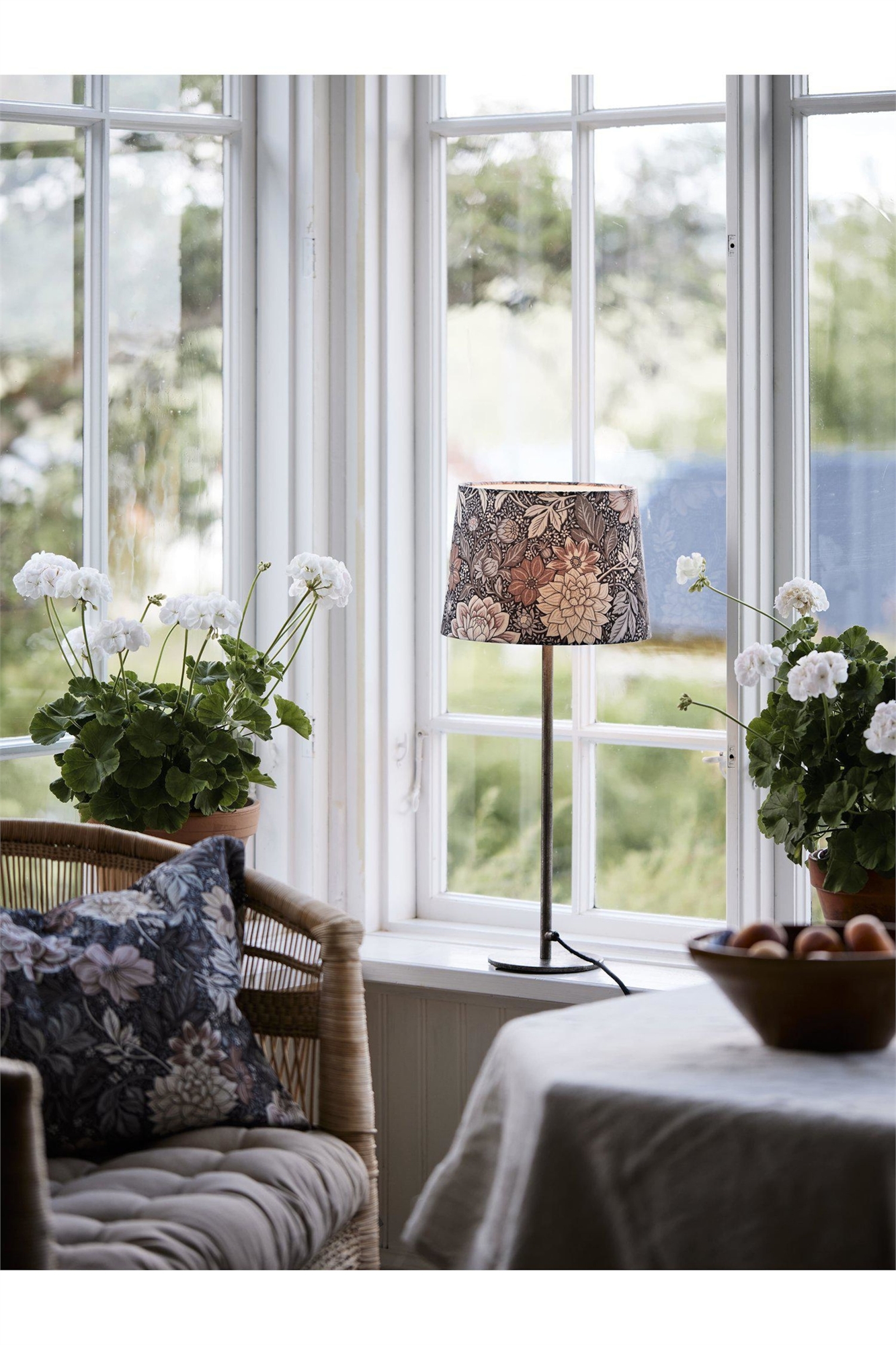 Металлическое основание лампы в простом и классическом дизайне с абажуром Dahlia Garden в бледно-розовой/зеленой цветовой гамме. Ручная роспись дизайнера Jenny Hahne Gadd для Boråstapeter. Привнесите в свою комнату прекрасные георгины и изящные листья. 25 см в диаметре внизу, 22 см вверху и 18 см в высоту. Фиксированный опорный каркас с розеткой E27. Изготовлена из 100% переработанного полиэстера, напечатана в Боросе. Высота основания лампы 45 см, ширина 14 см, текстильный кабель длиной 2 м с выключателем в 30 см от лампы. E 27, макс. 40 Вт.