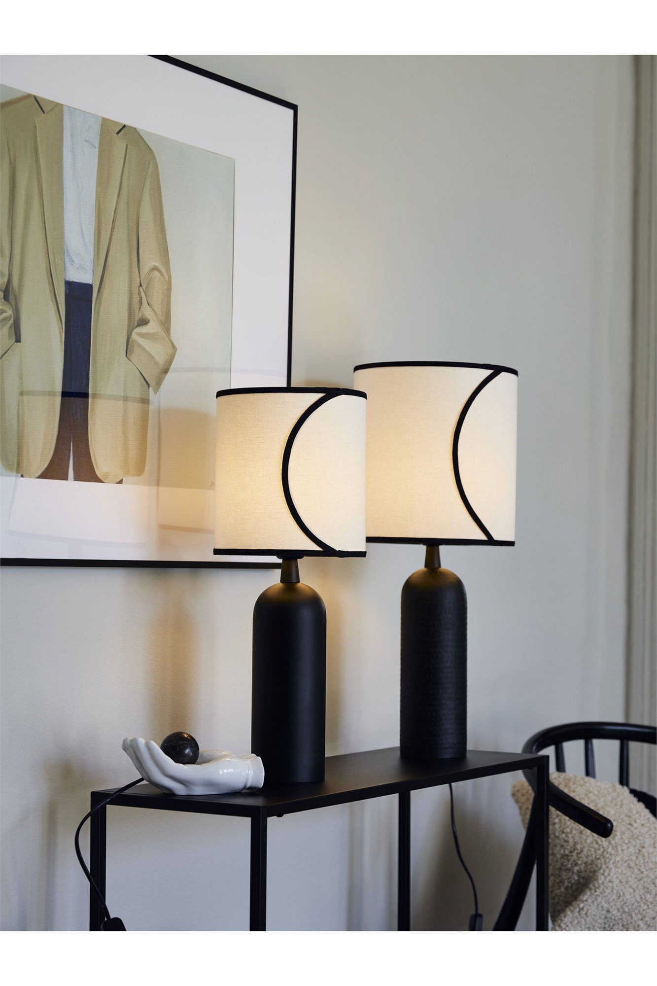 Основание лампы из черного металла с кованым узором. Представлена с абажуром Celyn Ava в белом/черном цвете. Абажур шириной 25 см и высотой 27 см имеет фиксированный каркас с цоколем E27. Основание лампы Riley длиной 38 см оснащено черным пластиковым кабелем длиной 160 см с выключателем. Цоколь E27, максимальная мощность 40 Вт. Общая высота лампы составляет 59 см.