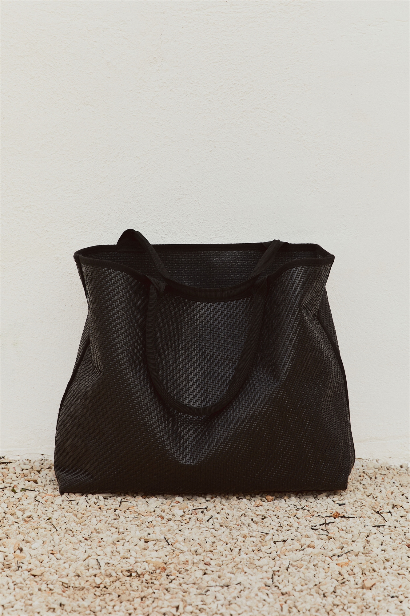 Пляжная сумка из структурного плетения с двумя ручками и отделкой по верхнему краю. Внутренняя отделка ламинирована, чтобы ваши вещи не попадали в песок. Глубина 16 см. Высота 40 см. Ширина 46 см.