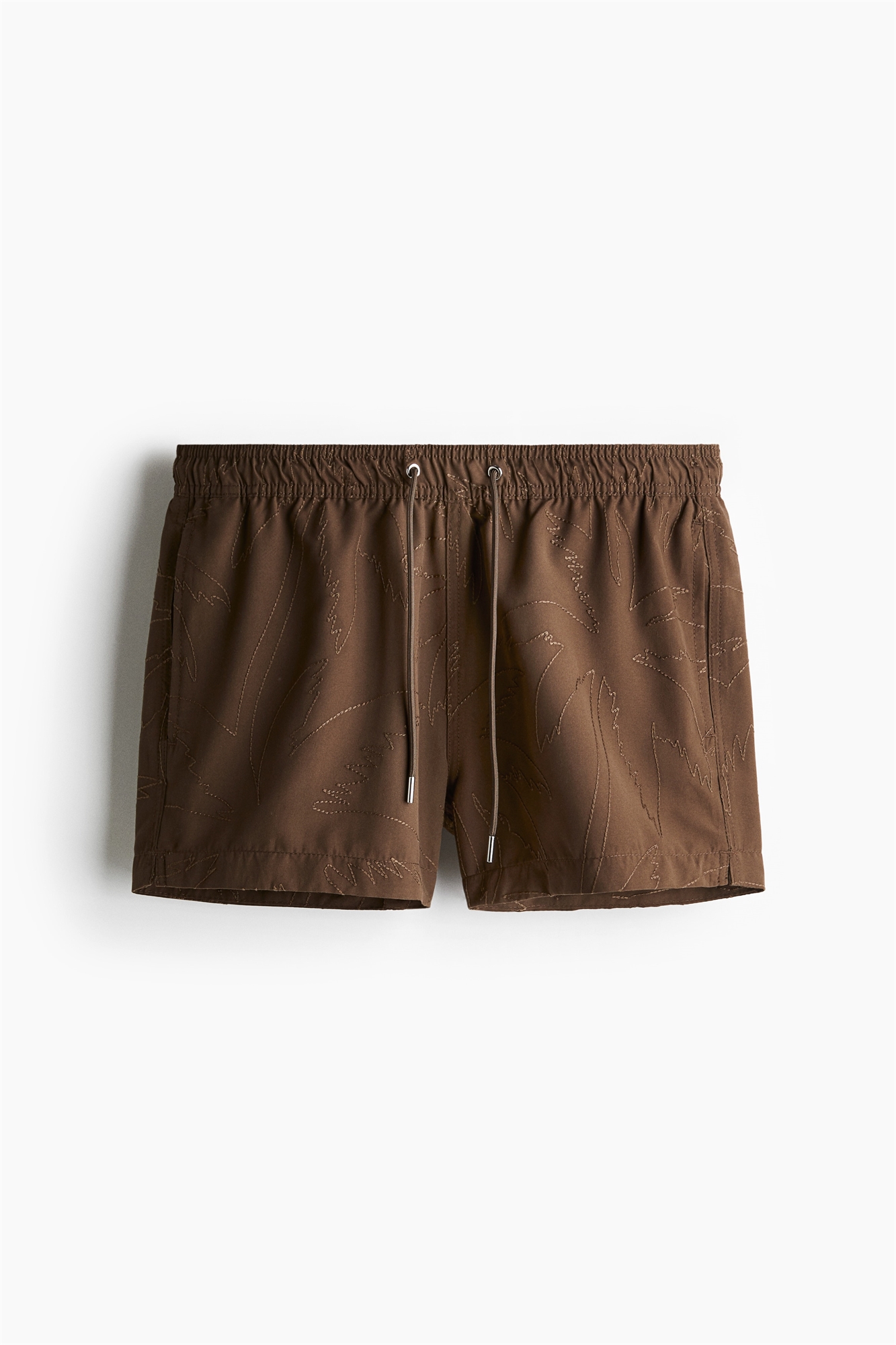 Шорты для плавания из мягкой ткани с вышитым узором. Эластичная резинка и завязки на талии, боковые карманы, накладной задний карман с застежкой на крючок и петлю и ножки, заканчивающиеся выше колен. Внутренние шорты из мягкой сетки.