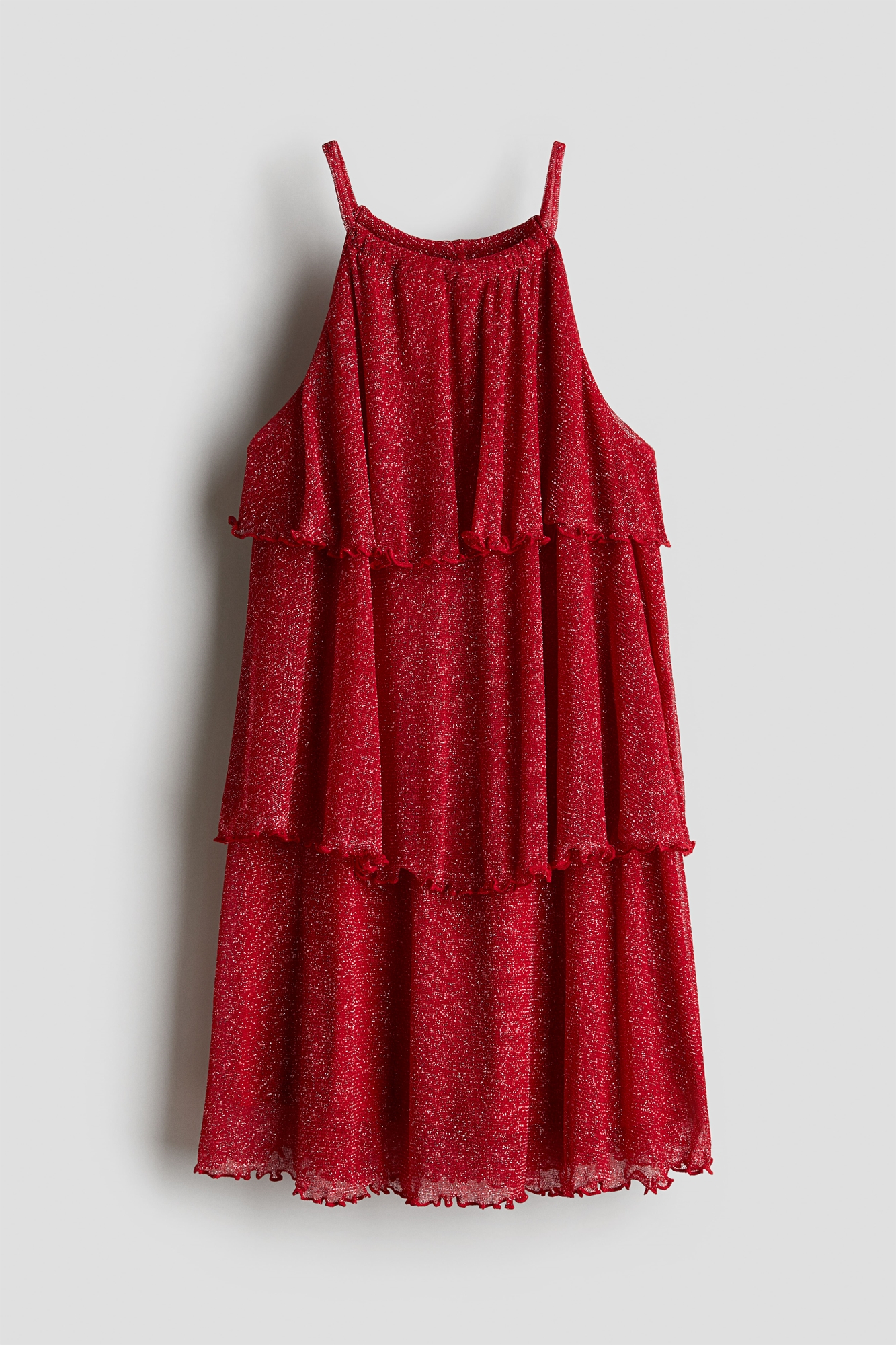 Платье из гладкого джерси с блестящими нитями с широкими ярусами с оверлочными краями, круглым вырезом и узкими бретелями. На подкладке.