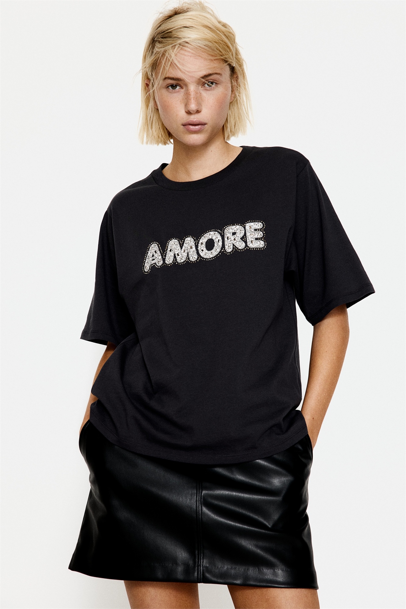 Свободная футболка из мягкого хлопкового джерси с мотивом спереди. Круглый вырез с ребристой отделкой, слегка спущенные плечи и прямой подол.