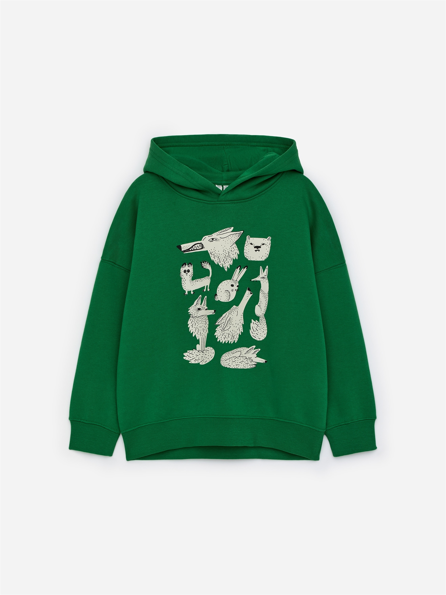Плотная толстовка с капюшоном сшита из хлопка. Модель с опущенными плечами, ребристой отделкой и принтом на груди.
