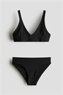 Полностью закрытое бикини с верхней частью и соответствующими нижними частями. Топ с V-образным вырезом, бретелями и пластиковой застежкой сзади.