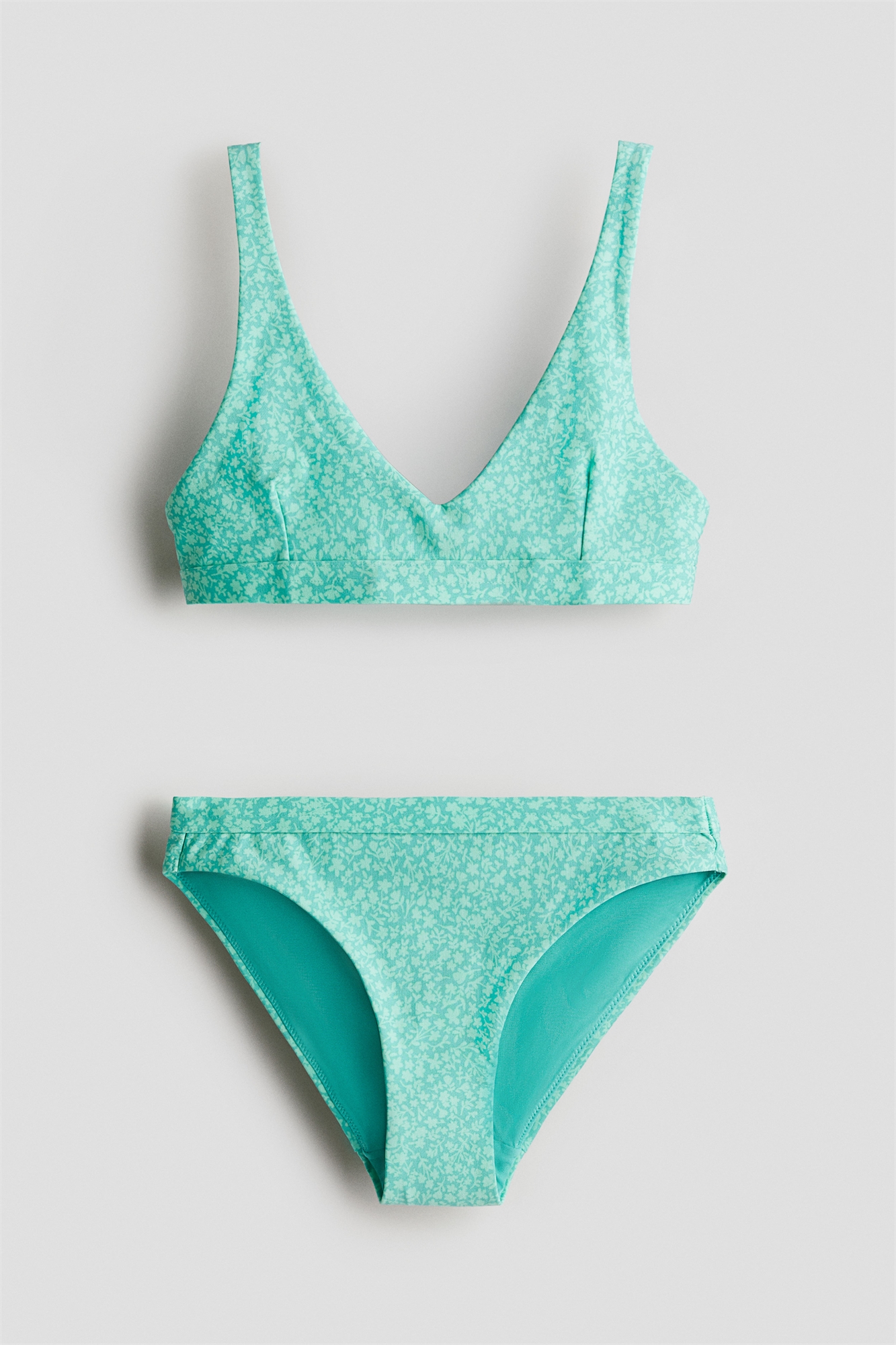Полностью закрытое бикини с верхней частью и соответствующими нижними частями. Топ с V-образным вырезом, бретелями и пластиковой застежкой сзади.
