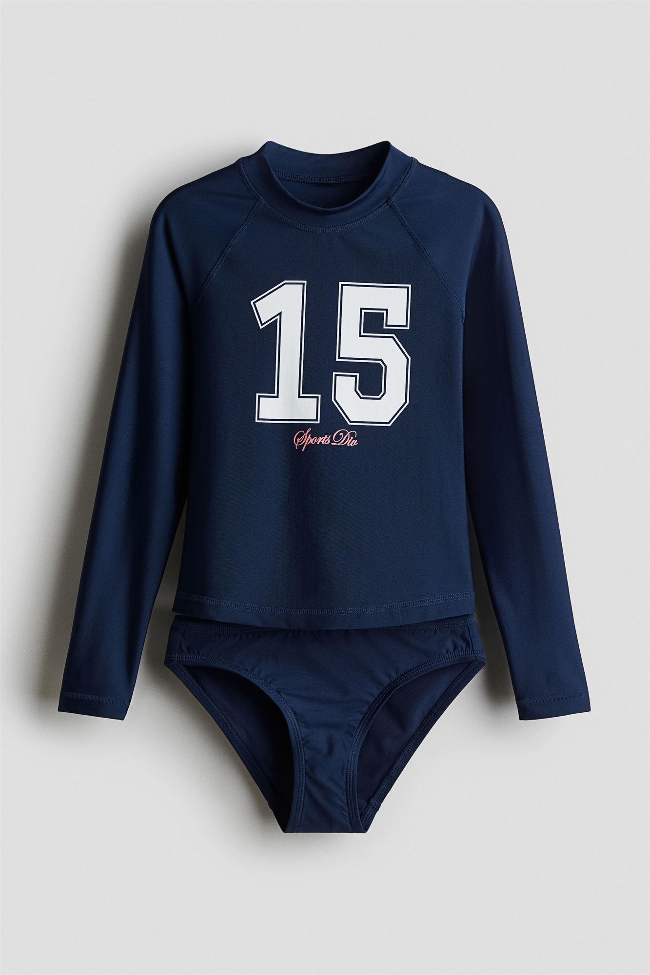 Комплект из купального топа и трусиков-бикини. Топ с принтом, небольшим воротником-стойкой и длинными рукавами реглан, чтобы свести к минимуму риск трения по швам.
