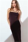 Приталенное платье длиной до колен из мягкого трикотажа с глубоким круглым вырезом и низкой спинкой. Бретельки продеваются через маленькие петельки и завязываются сзади.