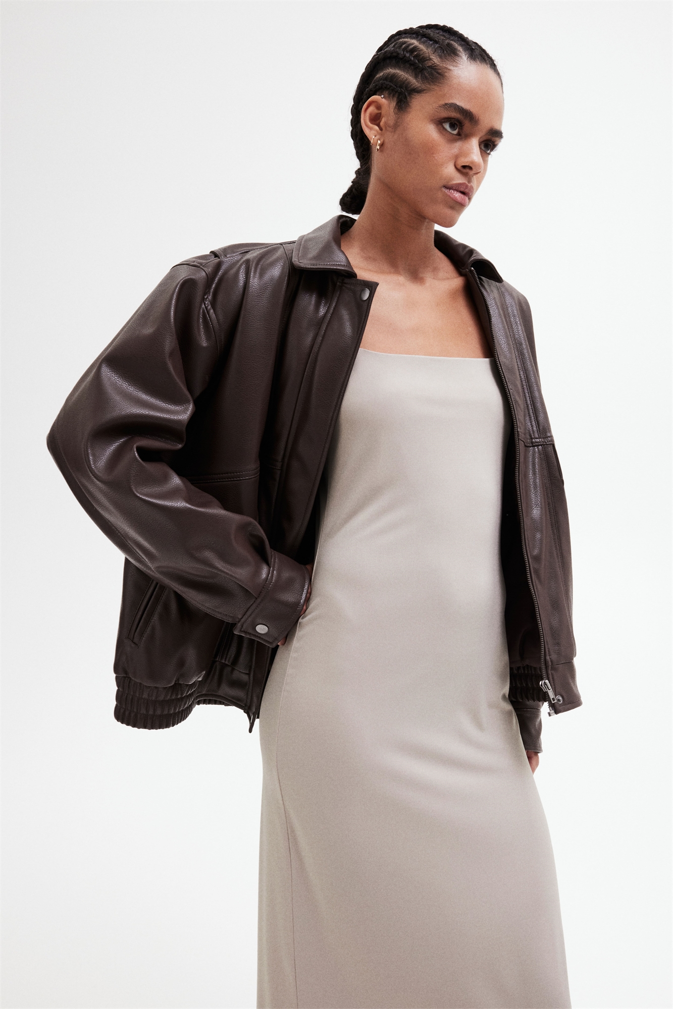 Приталенное платье длиной до колен из мягкого трикотажа с глубоким круглым вырезом и низкой спинкой. Бретельки продеваются через маленькие петельки и завязываются сзади.