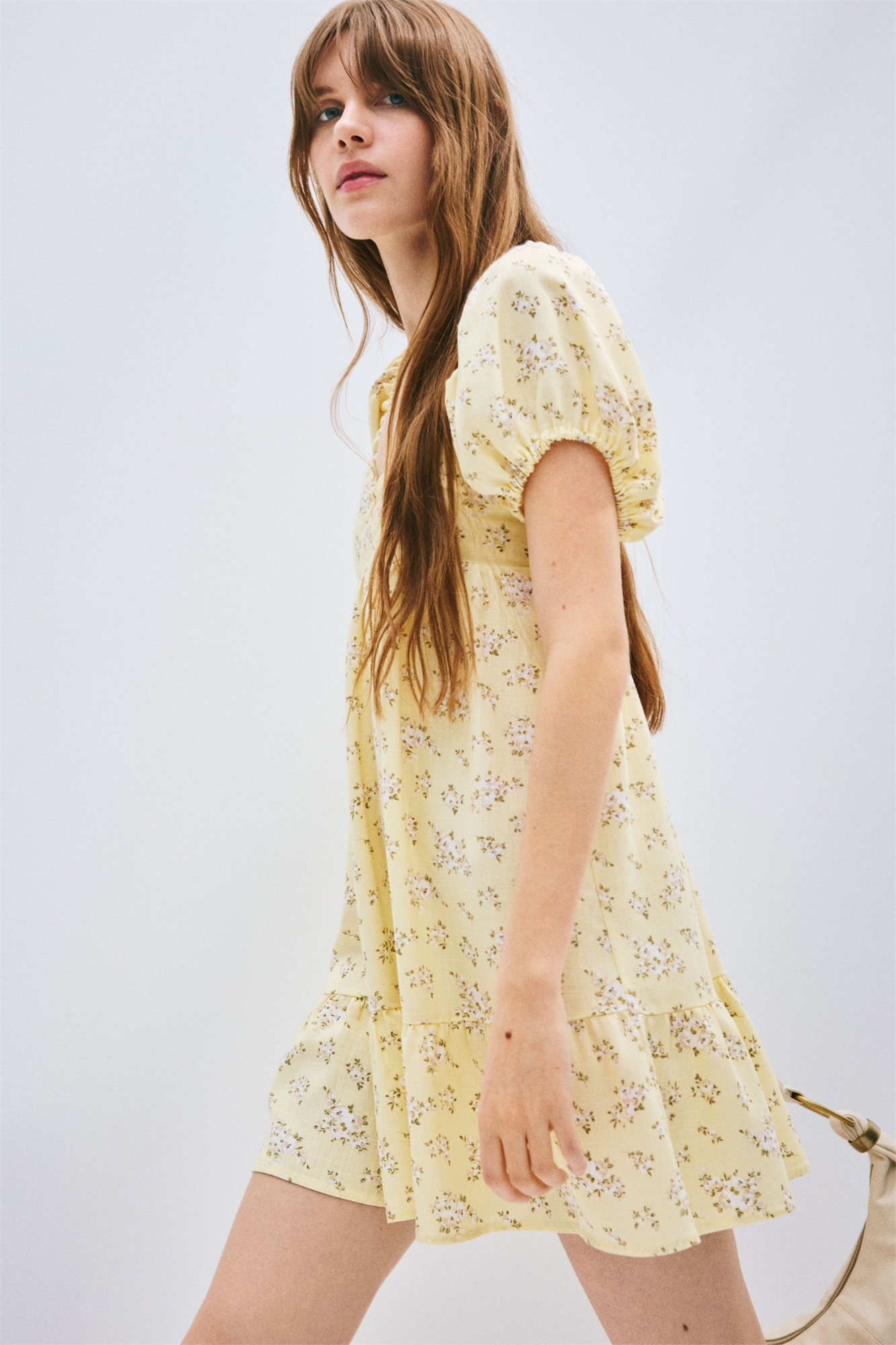 Короткое платье из воздушной ткани с вырезом в форме сердца, короткими пышными рукавами и узкой резинкой на плечах и манжетах. Завязки сзади и облегающий крой в области бюста со сборкой внизу. Расклешенная юбка со сборчатым швом над подолом.