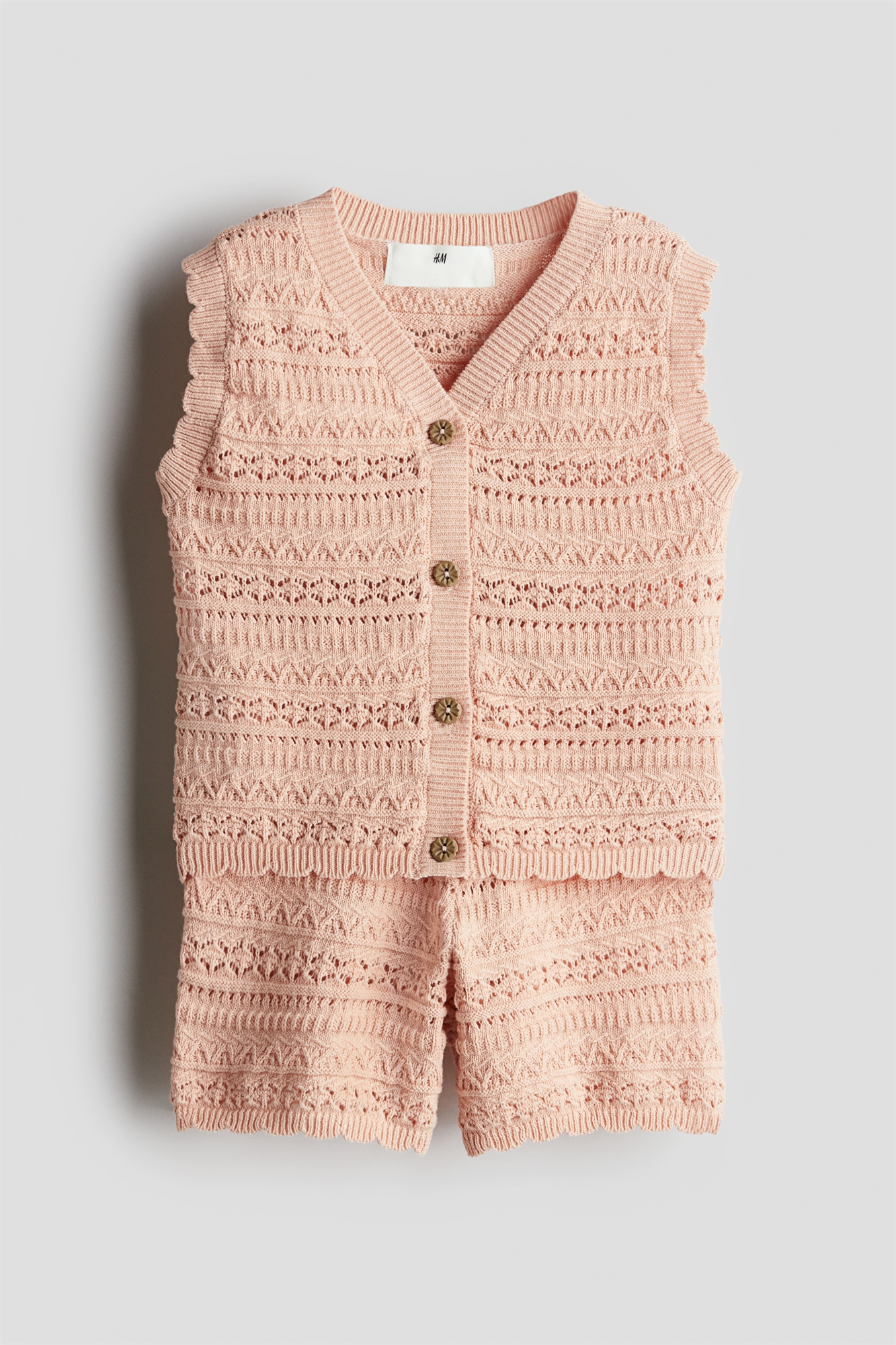 Комплект из свитера-жилета и пары шорт из мягкого хлопка с узорчатой вязкой. Свитер-жилет с V-образным вырезом в рубчик, пуговицами спереди и обрезным краем по проймам и подолу. Шорты с эластичной резинкой на талии и гребешковым краем по подолу.