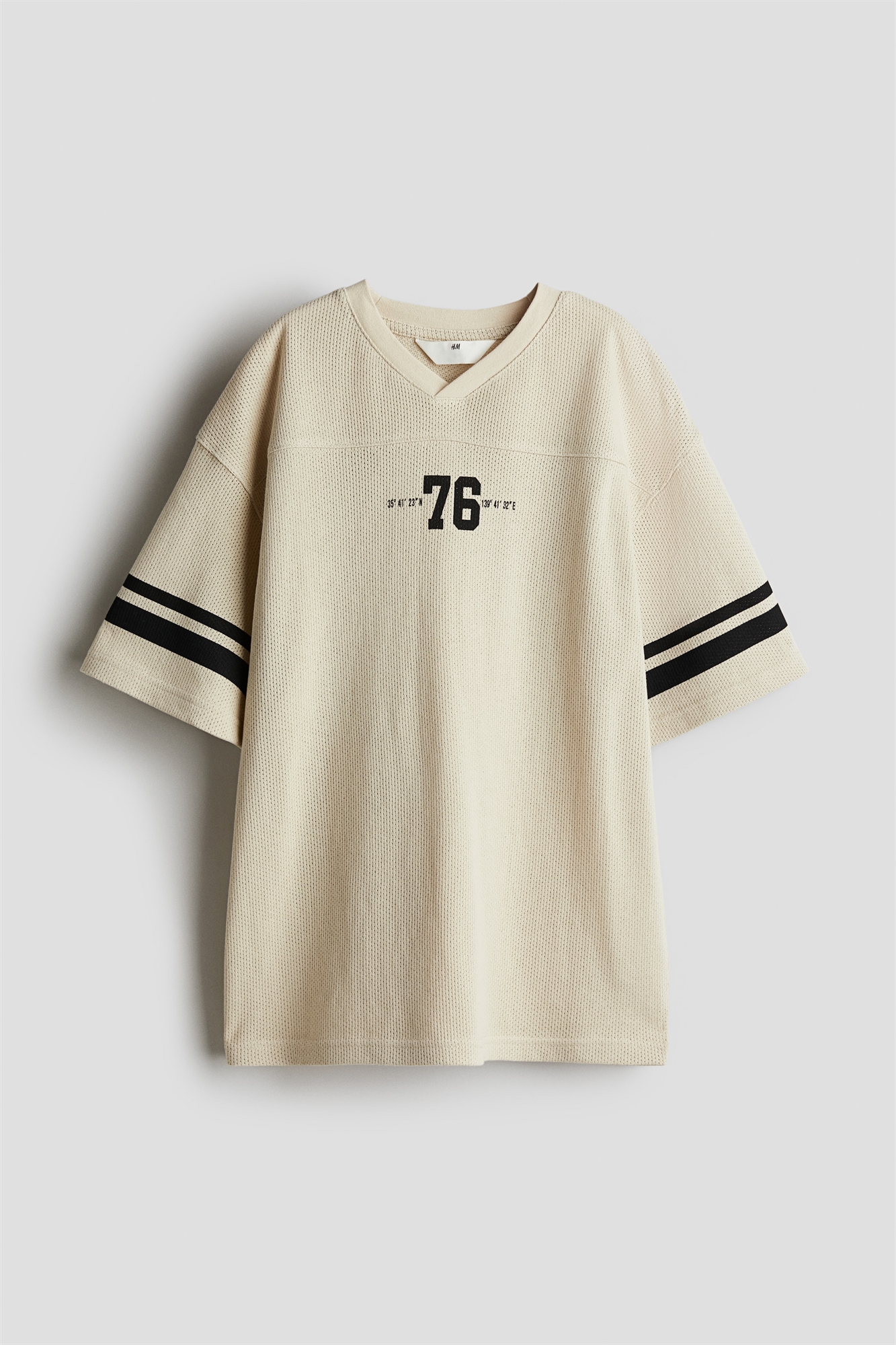 Свободная хоккейная рубашка из принтованной хлопковой сетки. V-образный вырез горловины с ребристой отделкой, передняя панель, спущенные плечи и короткие рукава.