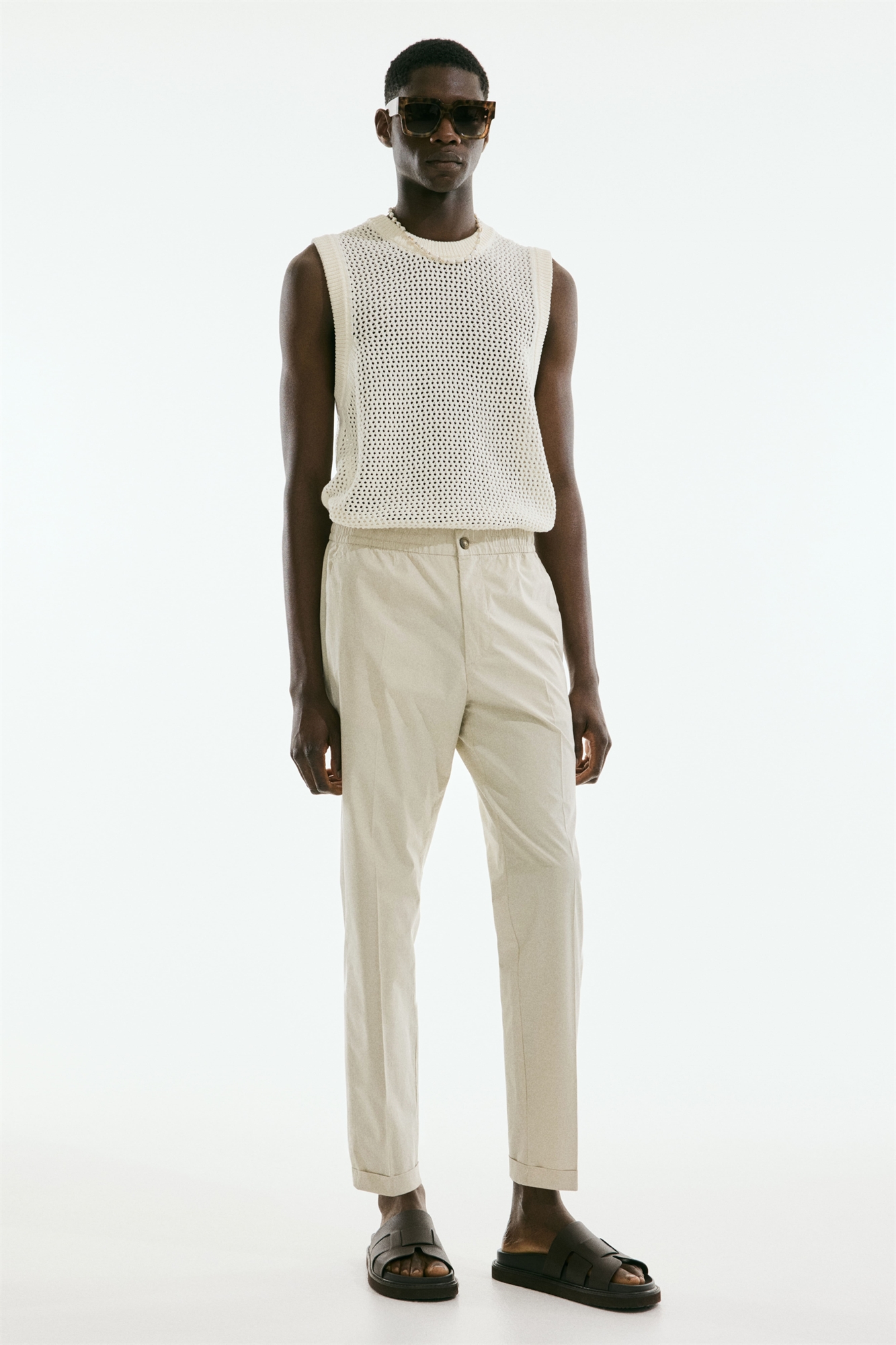 Брюки длиной до щиколотки из мягкой хлопковой саржи с эластичной отделкой и потайным шнурком на талии. Ширинка на молнии с пуговицей, диагональные передние карманы, накладные задние карманы с пуговицей и зауженные ноги со складками спереди и сзади. Регулярный крой для комфортной носки и классического силуэта.
