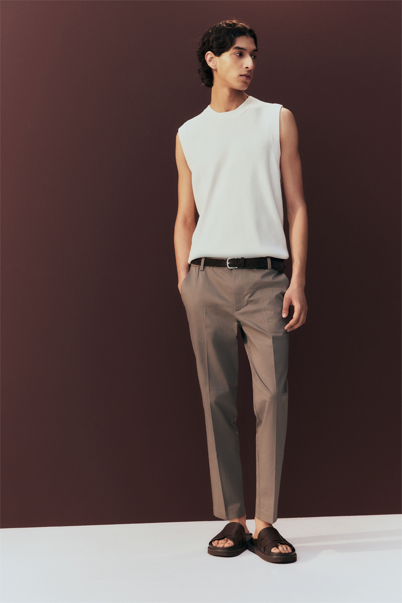 Брюки длиной до щиколотки из мягкой хлопковой саржи с эластичным поясом, ширинкой на молнии с пуговицей, диагональными боковыми карманами, втачными задними карманами с пуговицей и ногами со складками. Зауженный крой, облегающий контуры тела и создающий приталенный силуэт.