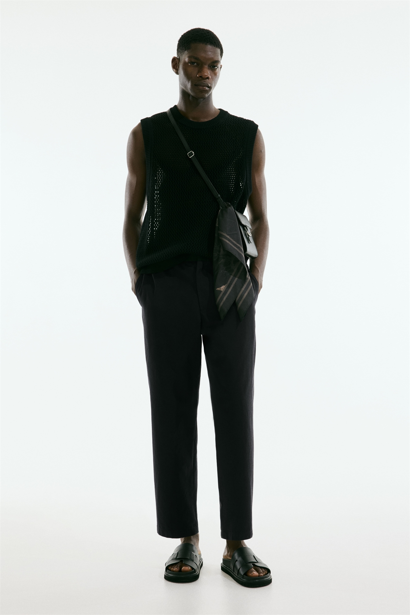 Брюки из мягкой саржи из смеси лиоцелла и хлопка. Эластичная талия, застежка на молнию с потайной застежкой на крючок и пуговицу, неброские боковые карманы и накладной задний карман. Свободный крой для непринужденного, но не чрезмерного силуэта.