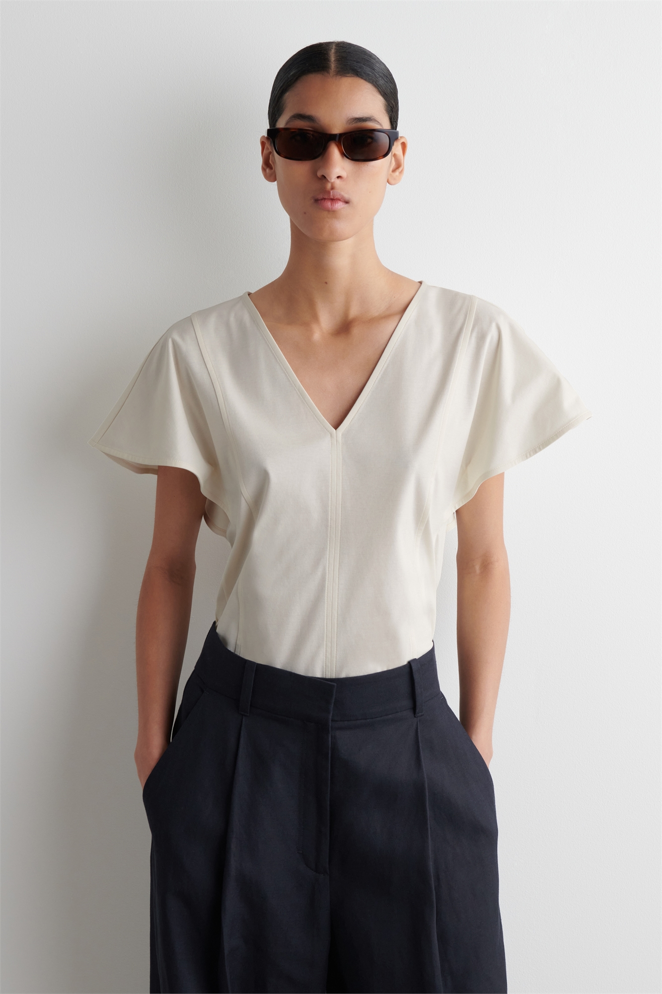 Эта современная модель предлагает обновленный взгляд на классическую футболку. Она сшита из мягкого хлопка-джерси приглушенного оттенка слоновой кости и имеет мягкую форму с V-образным вырезом, рукавами в форме лепестков и тонкой отделкой на талии. Узкий крой Материал: 100% хлопок. Без учета отделки / Машинная стирка Длина по спинке для размера S составляет 59,4 см / Модель носит размер S