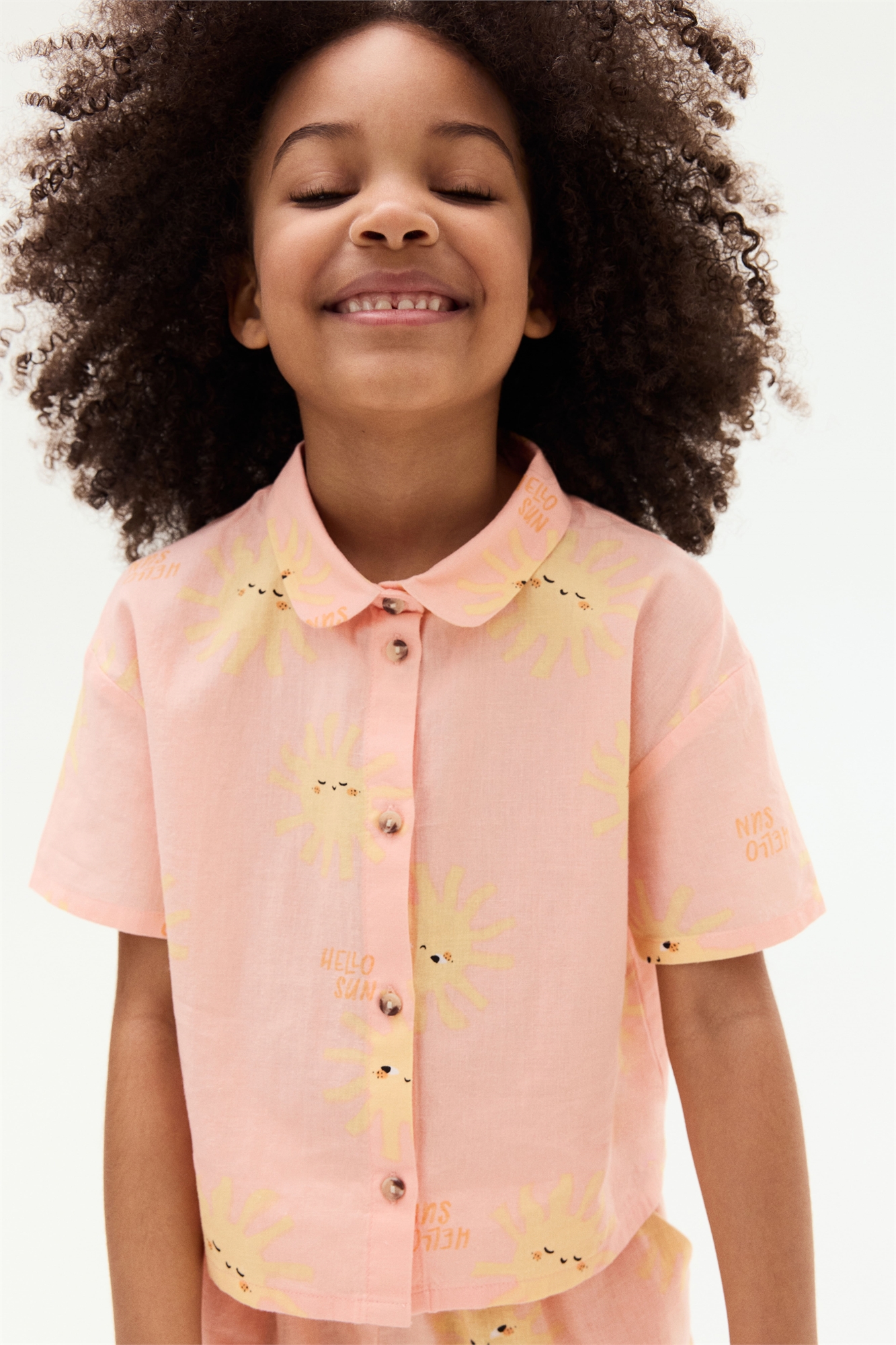 Блузка с короткими рукавами из смеси хлопка и льна с округлым воротником, пуговицами спереди и спущенными плечами.