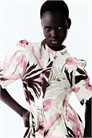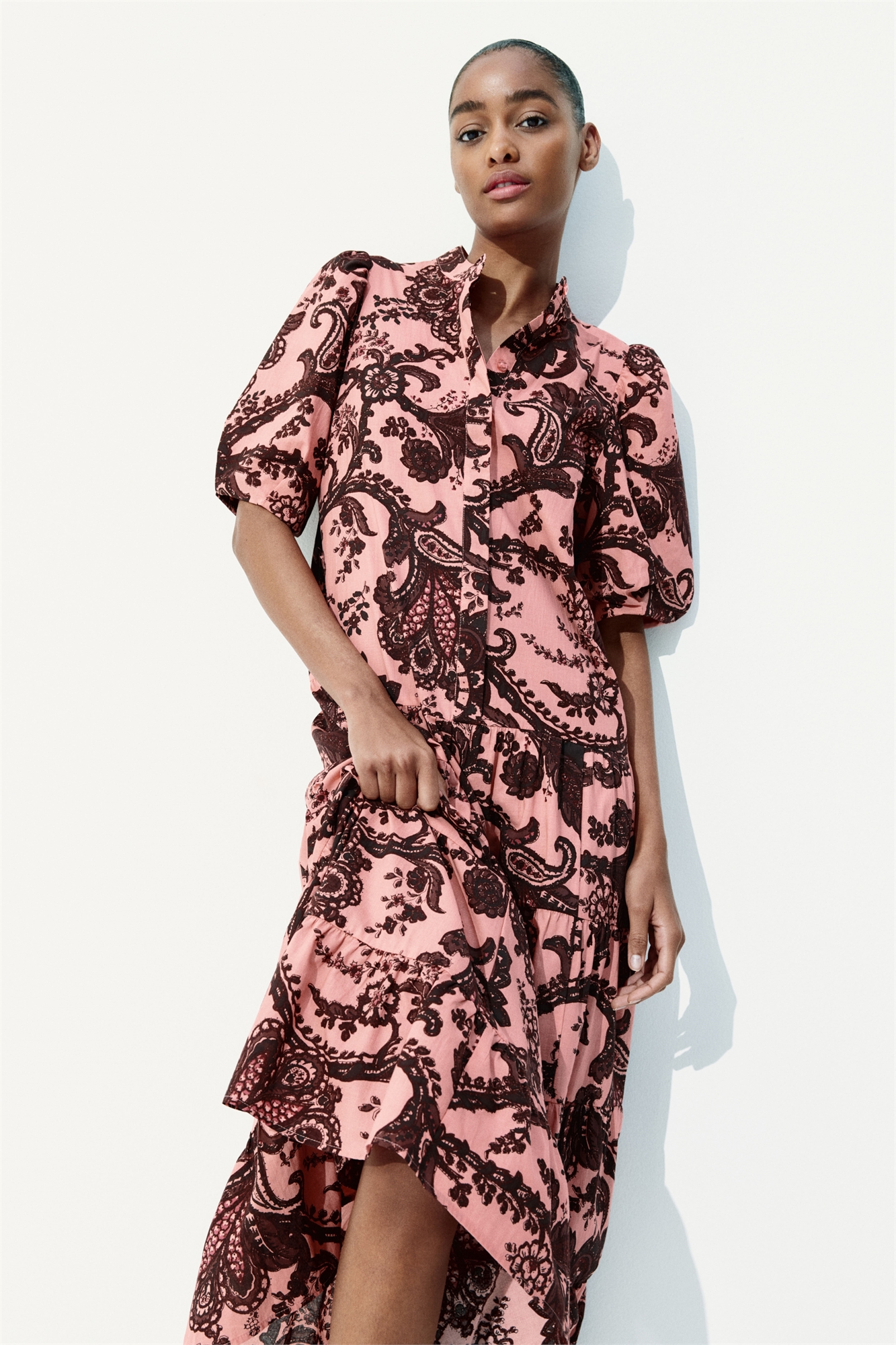 Платье длиной до щиколоток из воздушного хлопкового полотна с воротником-бантом и потайными пуговицами в верхней части. Короткие рукава-баллон и узкий съемный пояс-завязка на талии. Расклешенная юбка с собранными ярусами для придания объема. Без подкладки.
