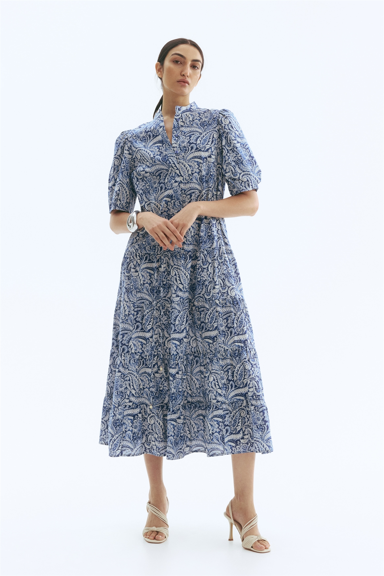 Платье длиной до щиколоток из воздушного хлопкового полотна с воротником-бантом и потайными пуговицами в верхней части. Короткие рукава-баллон и узкий съемный пояс-завязка на талии. Расклешенная юбка с собранными ярусами для придания объема. Без подкладки.