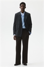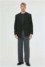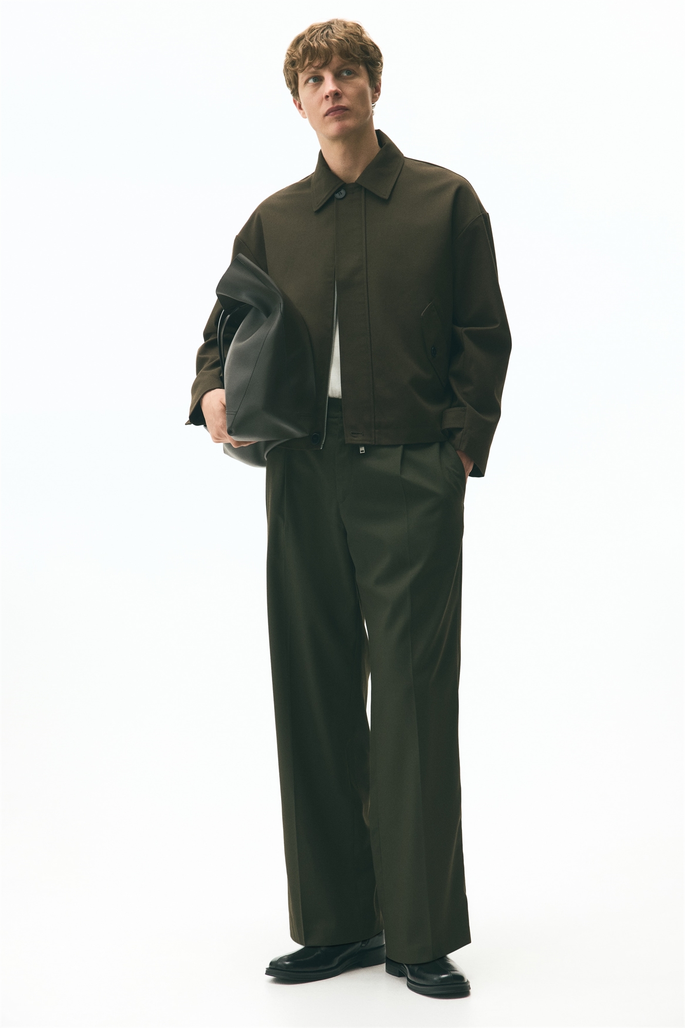 Приталенные брюки из мягкой ткани со складками в верхней части, ширинкой на молнии и поясом со скрытой застежкой на пуговицу и крючок-штангу. Диагональные боковые карманы, втачные задние карманы и широкие ноги со складками. Свободный крой для пышного, но не чрезмерно большого силуэта.