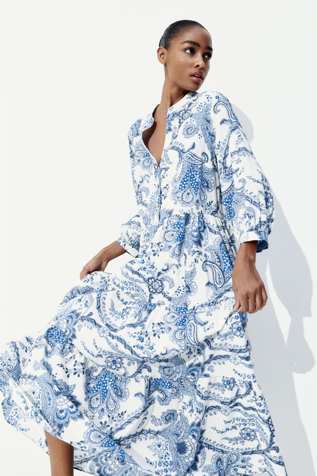 Платье длиной до колен из хлопкового полотна с воротником-бантом, V-образной проймой и пуговицами спереди. Рукава-баллоны длиной 3/4 с узкими манжетами. Расклешенная юбка с ярусами для придания объема. Без подкладки.