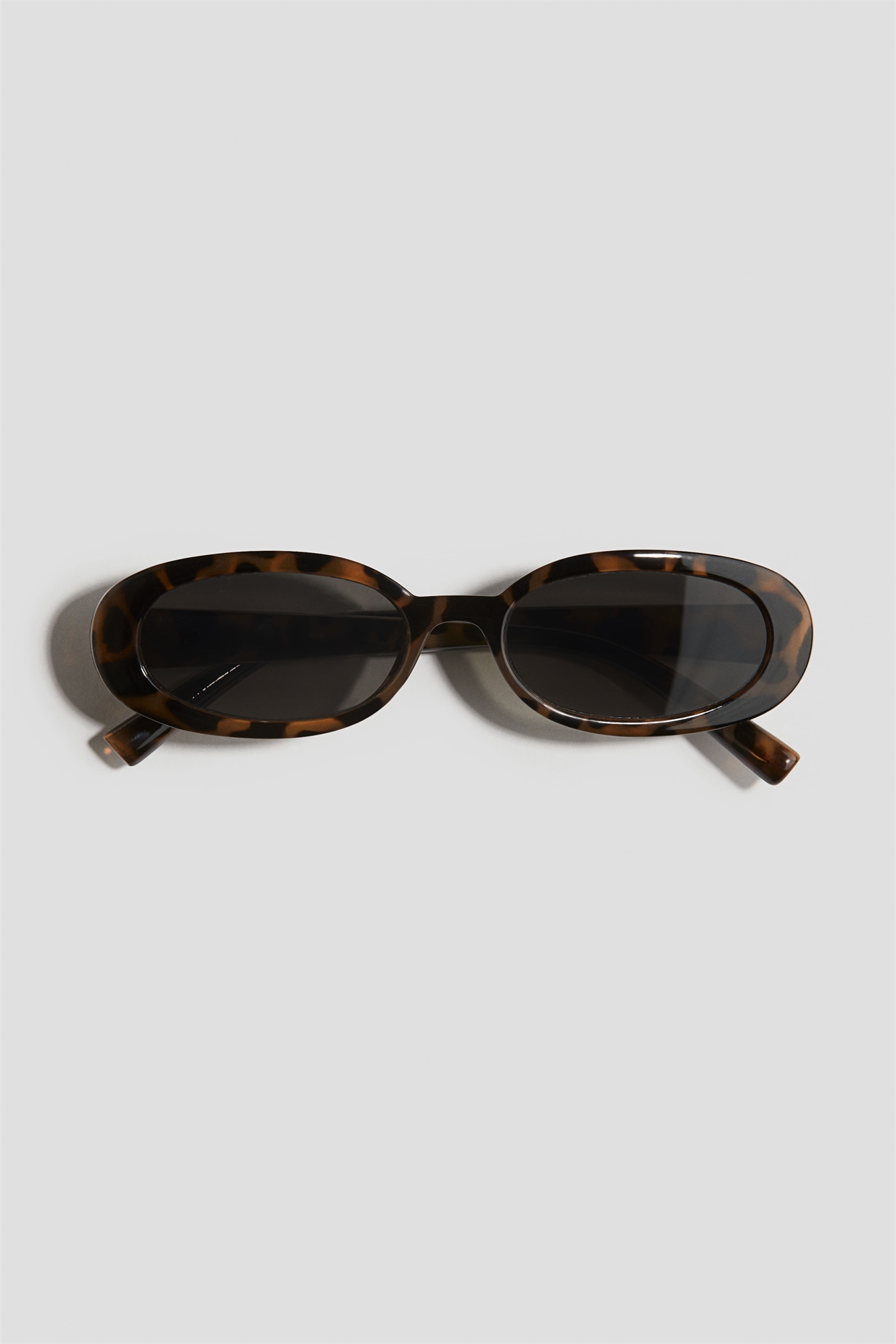 Овальные солнцезащитные очки с оправой и боковыми дужками из глянцевого пластика. Тонированные пластиковые линзы с УФ-защитой.
