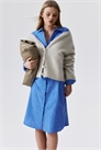 Платье-рубашка длиной до колена свободного покроя из воздушного хлопка и льна. Открытый воротник, пуговицы спереди и съемный пояс с завязками-спагетти на талии. Длинные рукава со складками сзади и рукава со втачным рукавом и манжетами на пуговицах. Закругленный подол с боковыми вентиляционными отверстиями. Без подкладки.