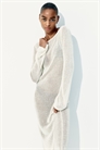 Приталенное платье длиной до колен из мягкого трикотажа, выполненного из шелковой смеси тутового цвета. Вырез-лодочка и длинные, слегка расклешенные рукава. Узкая тесьма на манжетах и подоле.