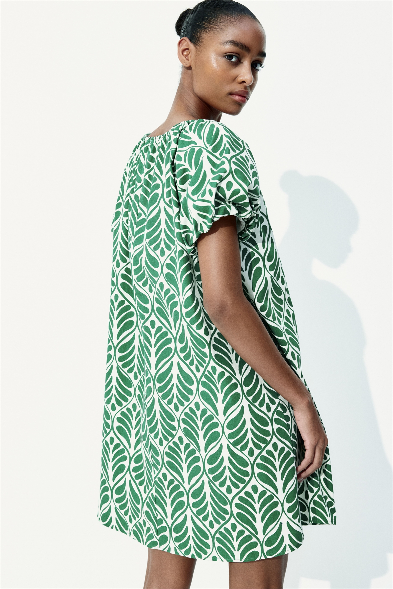 Короткое платье из хлопкового полотна с воздушным силуэтом A-line. Свободный крой с круглым вырезом на завязках и короткими рукавами реглан. Без подкладки.