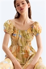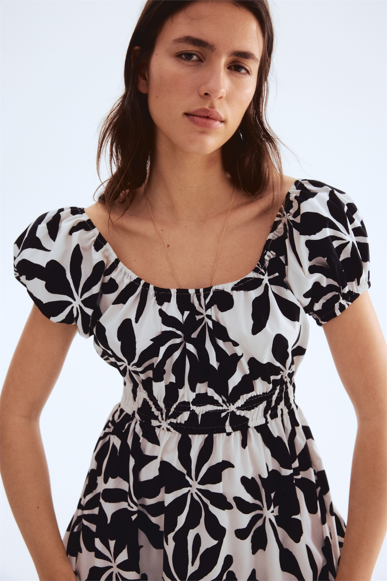 Платье длиной до колен, без плеч, из хрустящего хлопкового поплина с узкой эластичной резинкой по верху и короткими пышными рукавами с эластичными манжетами. Эластичная резинка на талии и расклешенная юбка. Без подкладки.